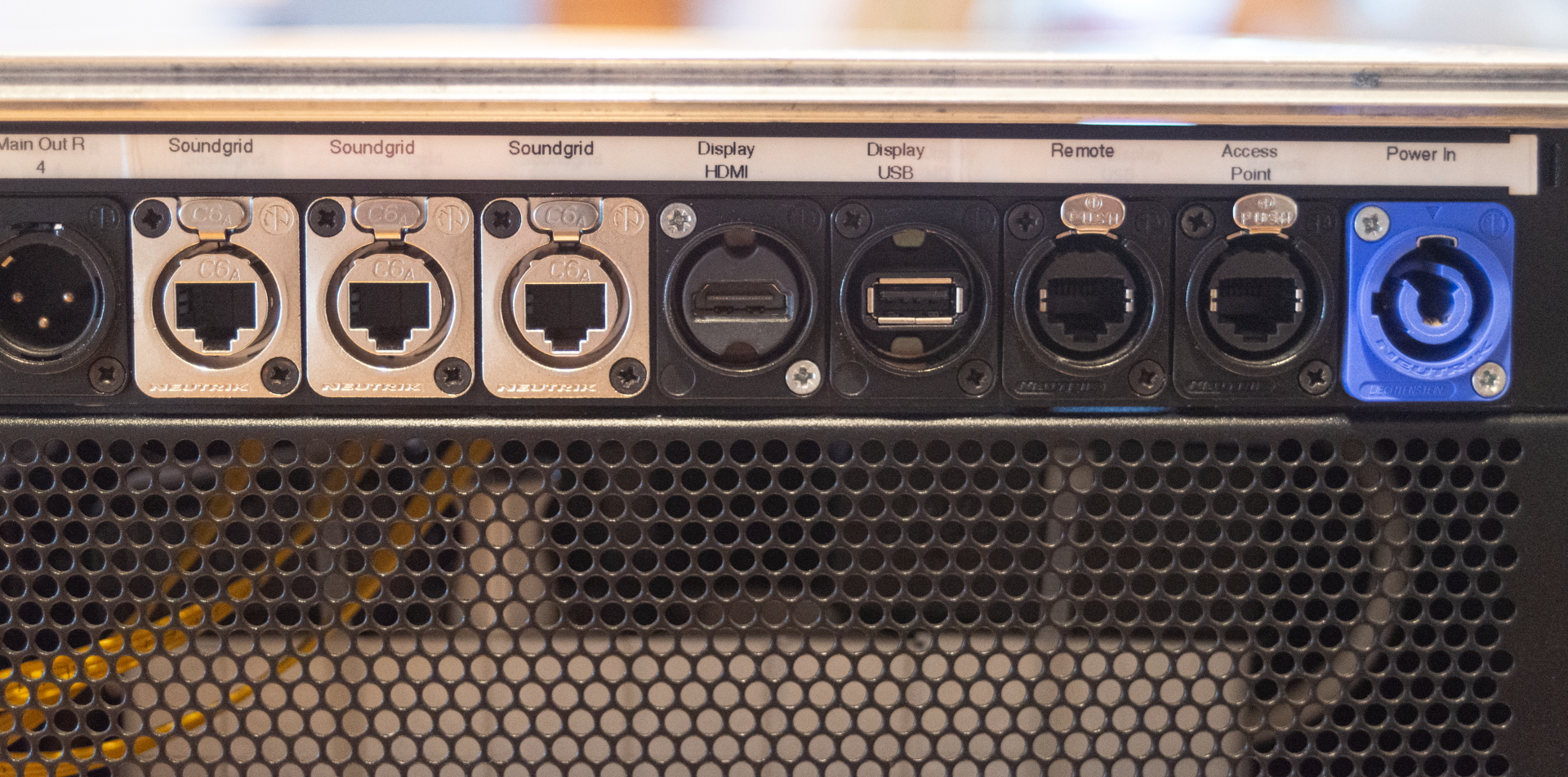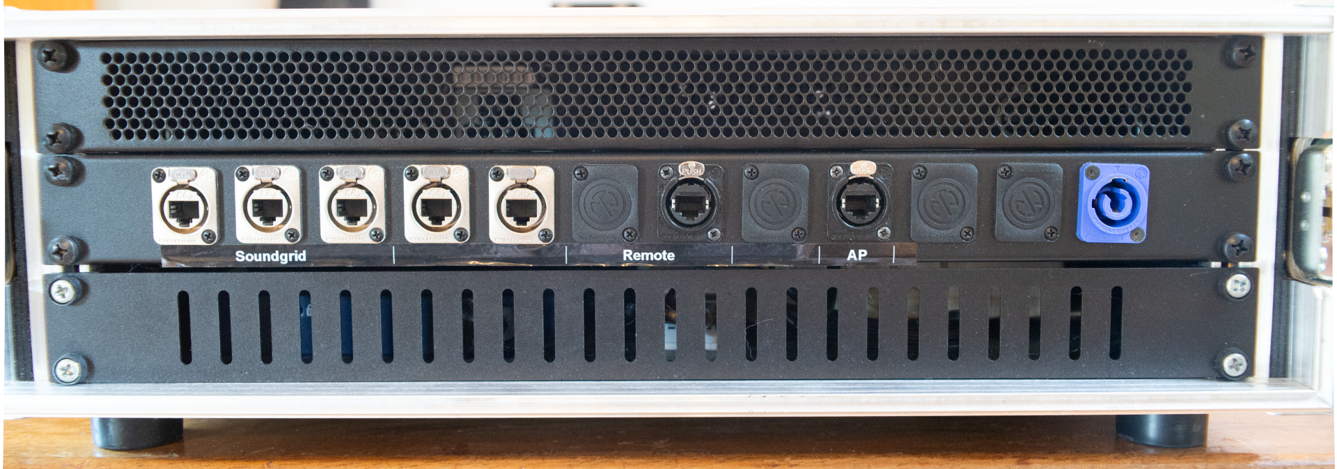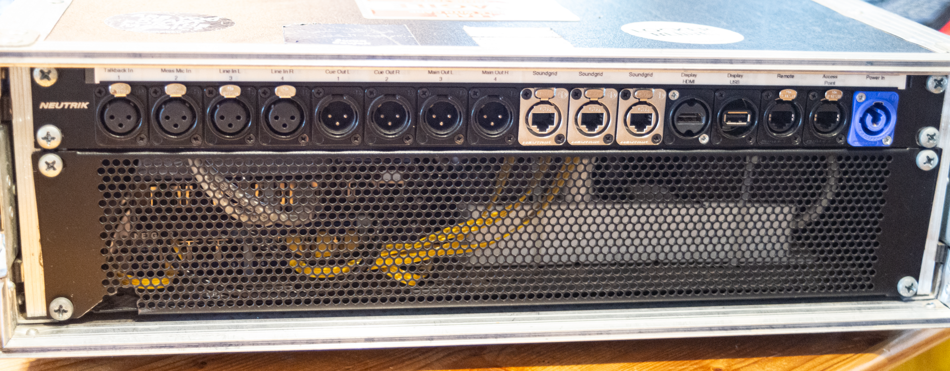 mit eingebautem Netgear GS105 Switch für Soundgrid und Ubiquiti Edgerouter für Remote-Netzwerk. Anschlüsse für Faderbank, WLAN, zusätzlichen Bildschirm.
