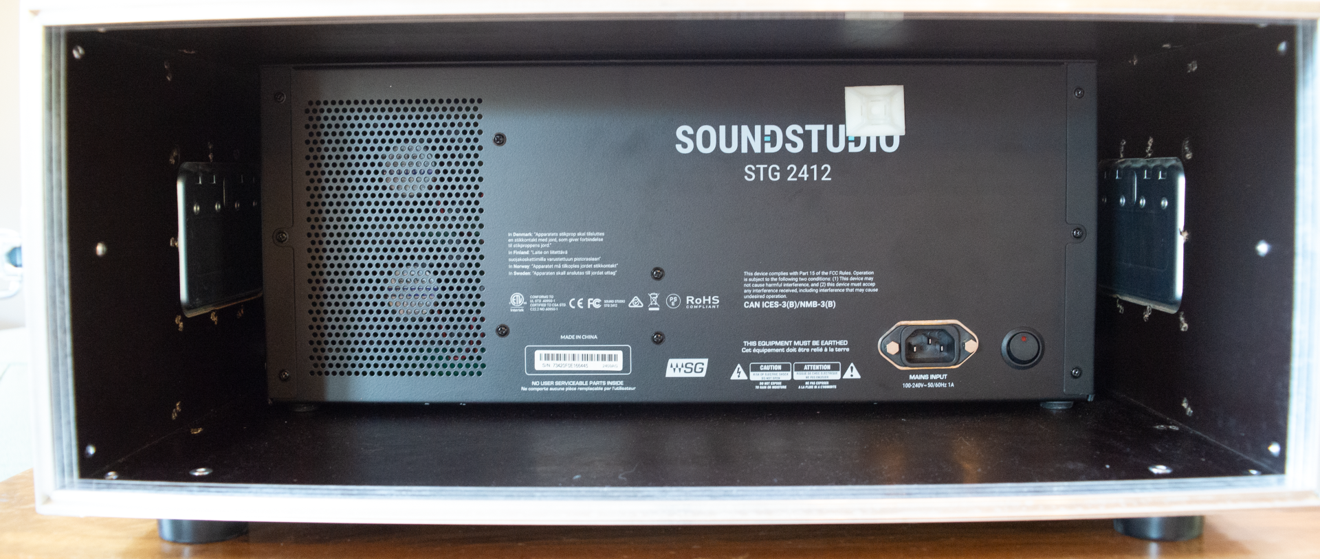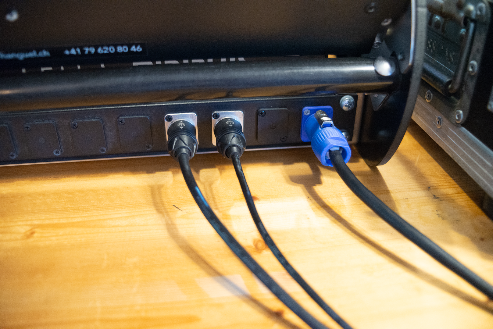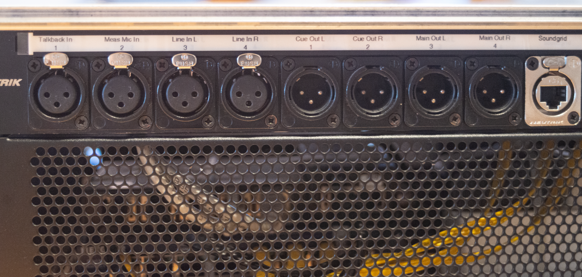 mit eingebautem Netgear GS105 Switch für Soundgrid und Ubiquiti Edgerouter für Remote-Netzwerk. Anschlüsse für Faderbank, WLAN, zusätzlichen Bildschirm.