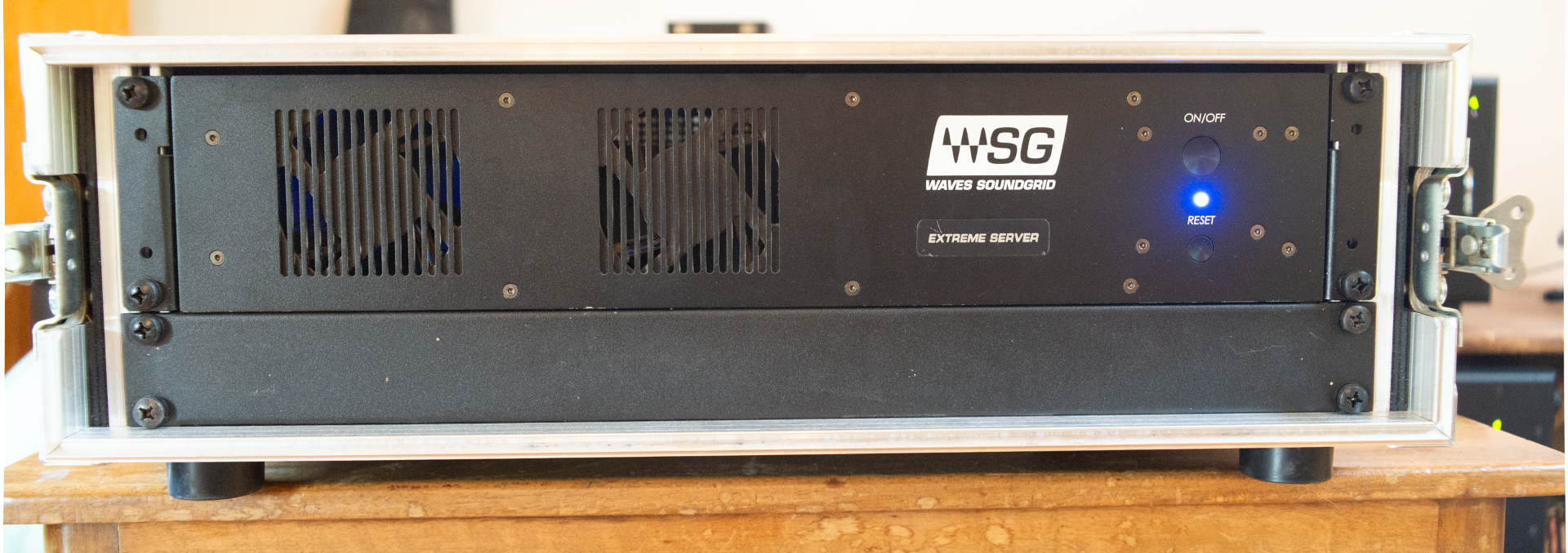 - 1x FoH Rack mit Waves Axis und Digigrid D auf Schiene (2x Preamp, 2x Line-Input, 4x Line Outputs alle aus XLR)