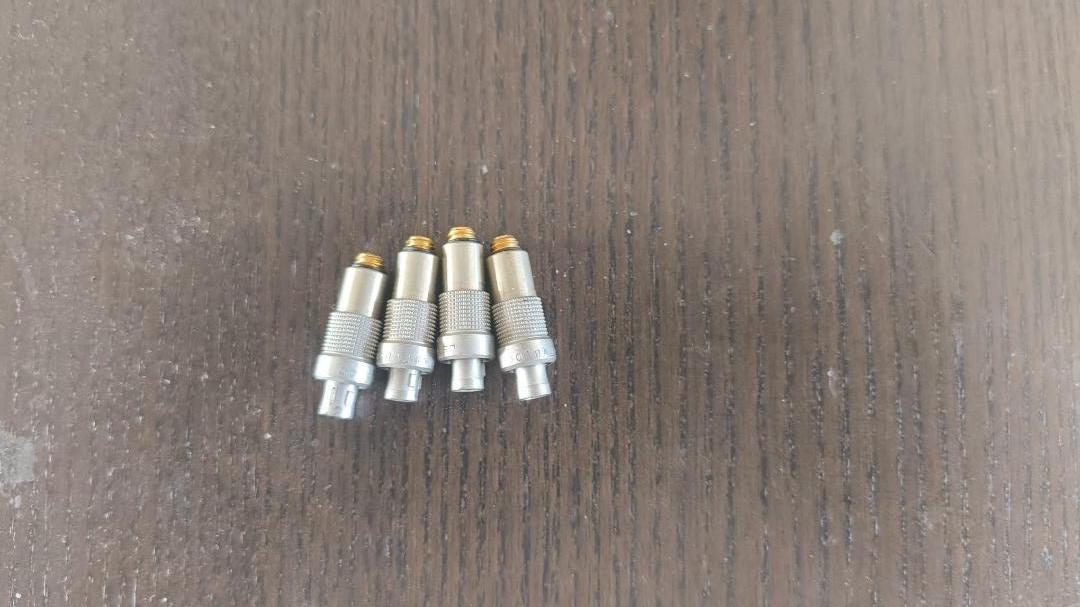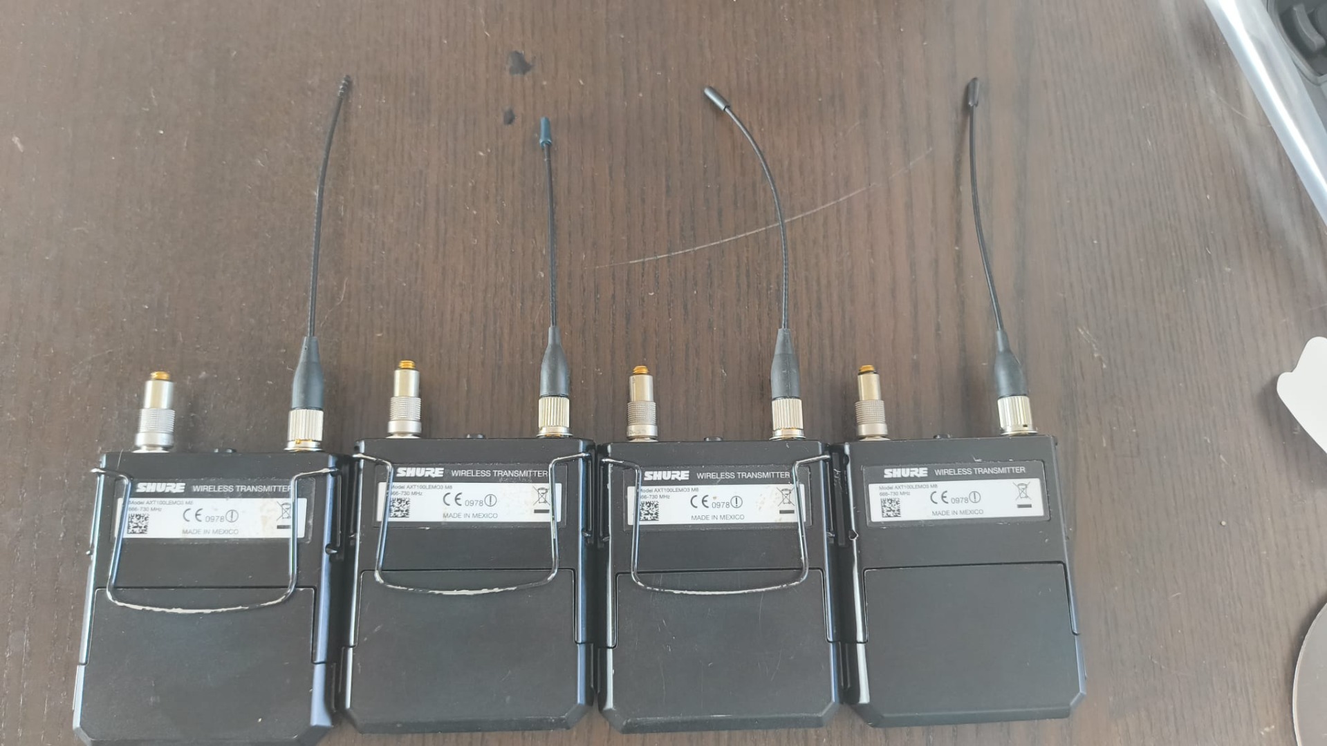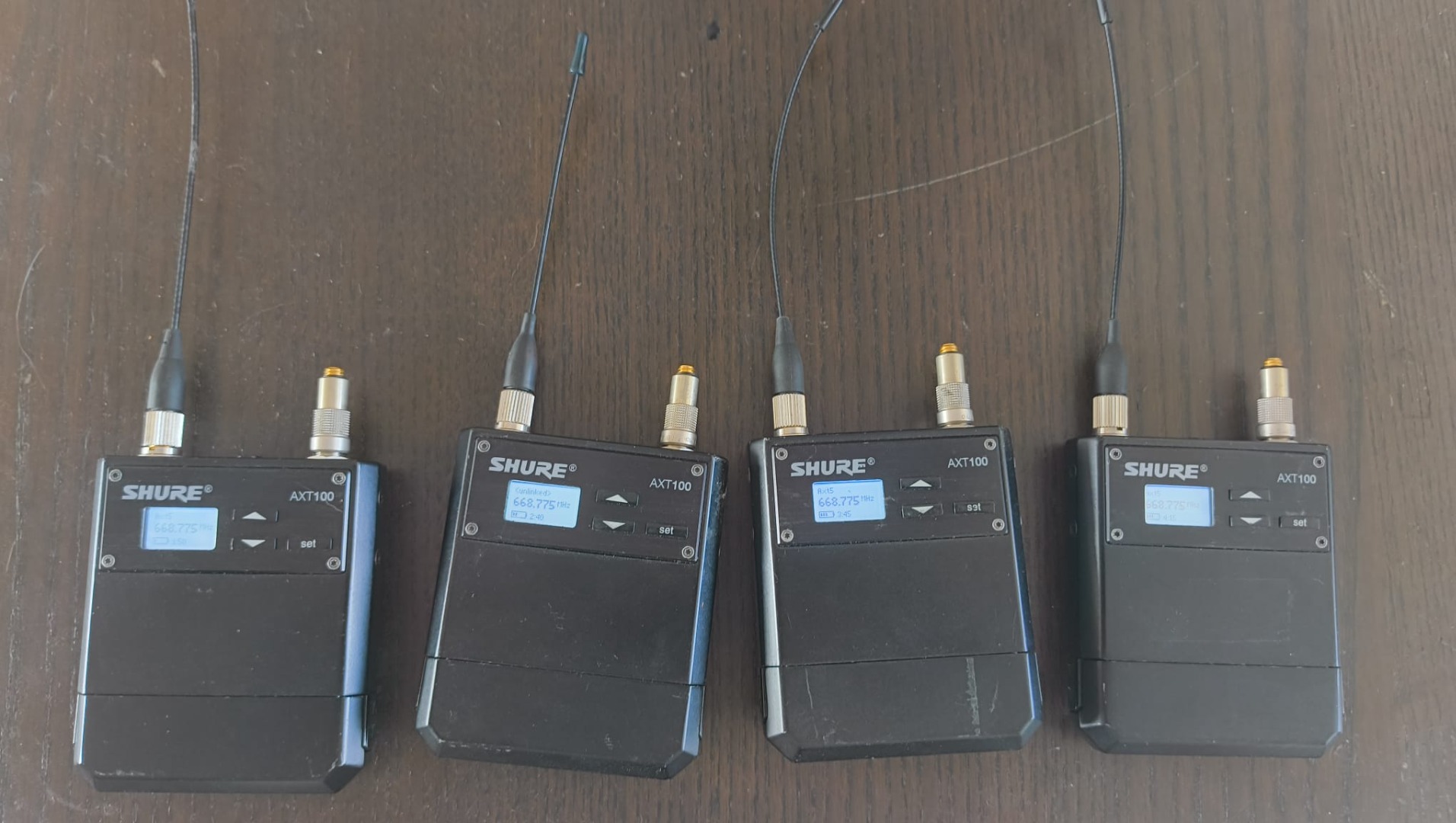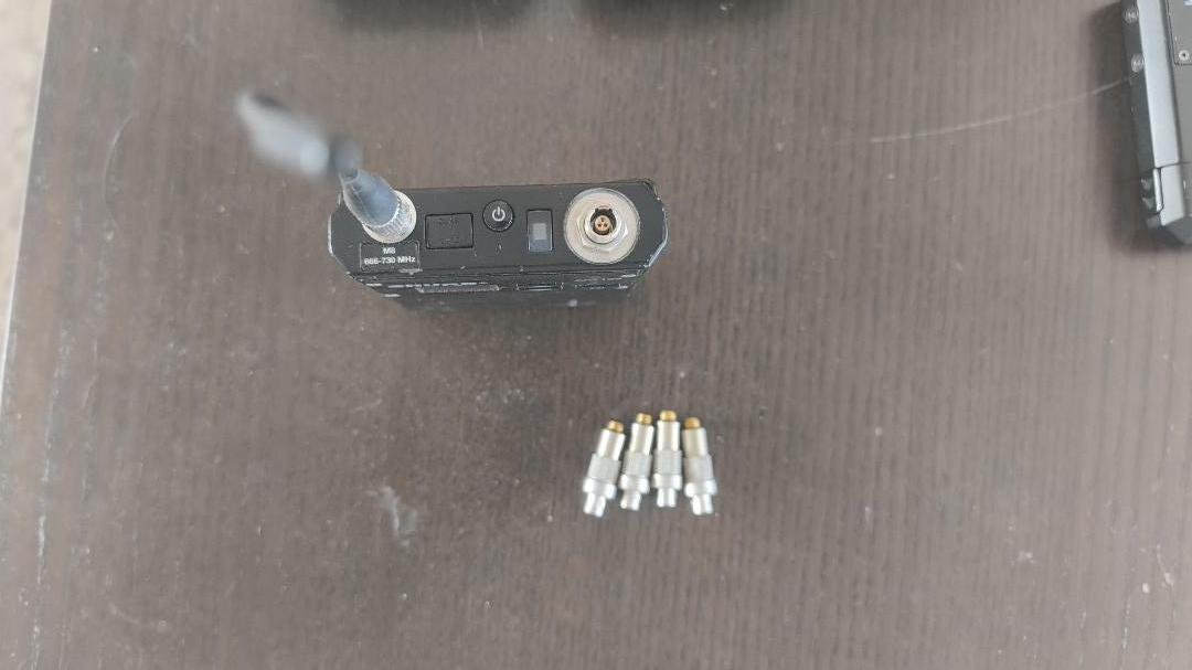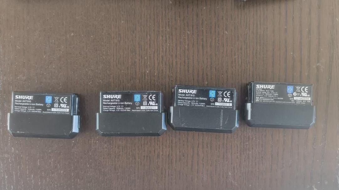 Verkaufe 4 × Shure AXT100 Bodypack Transmitter (666–730 MHz) inklusive original AXT910 Lithium-Ionen Akkus und Lemo-zu-Microdot-Adaptern.