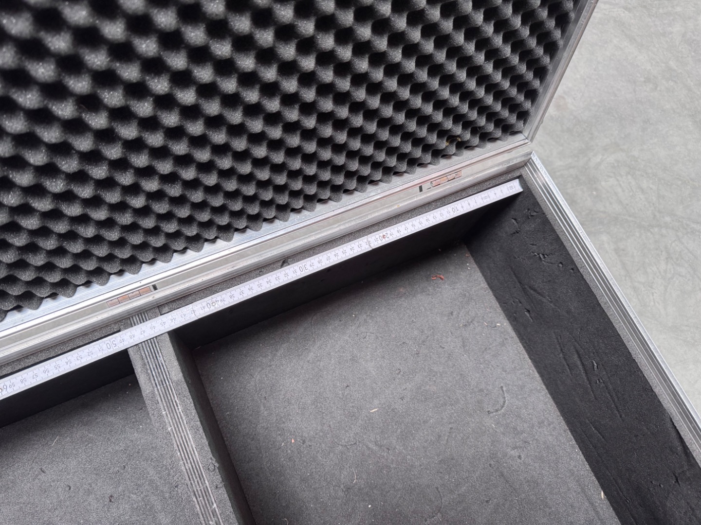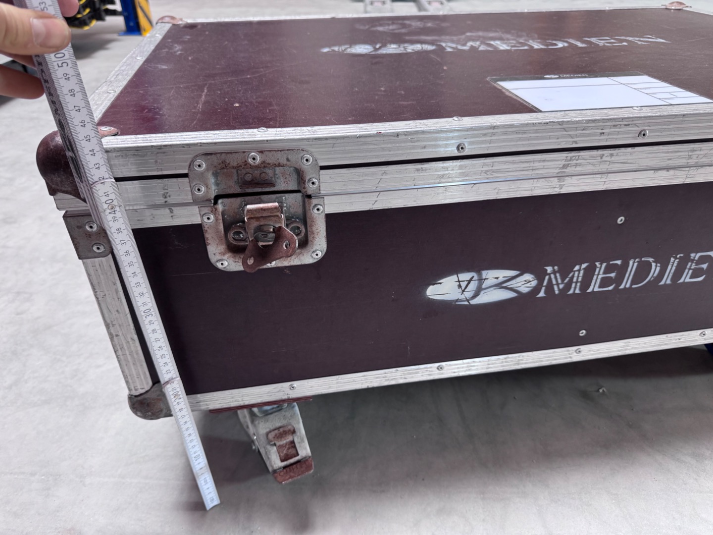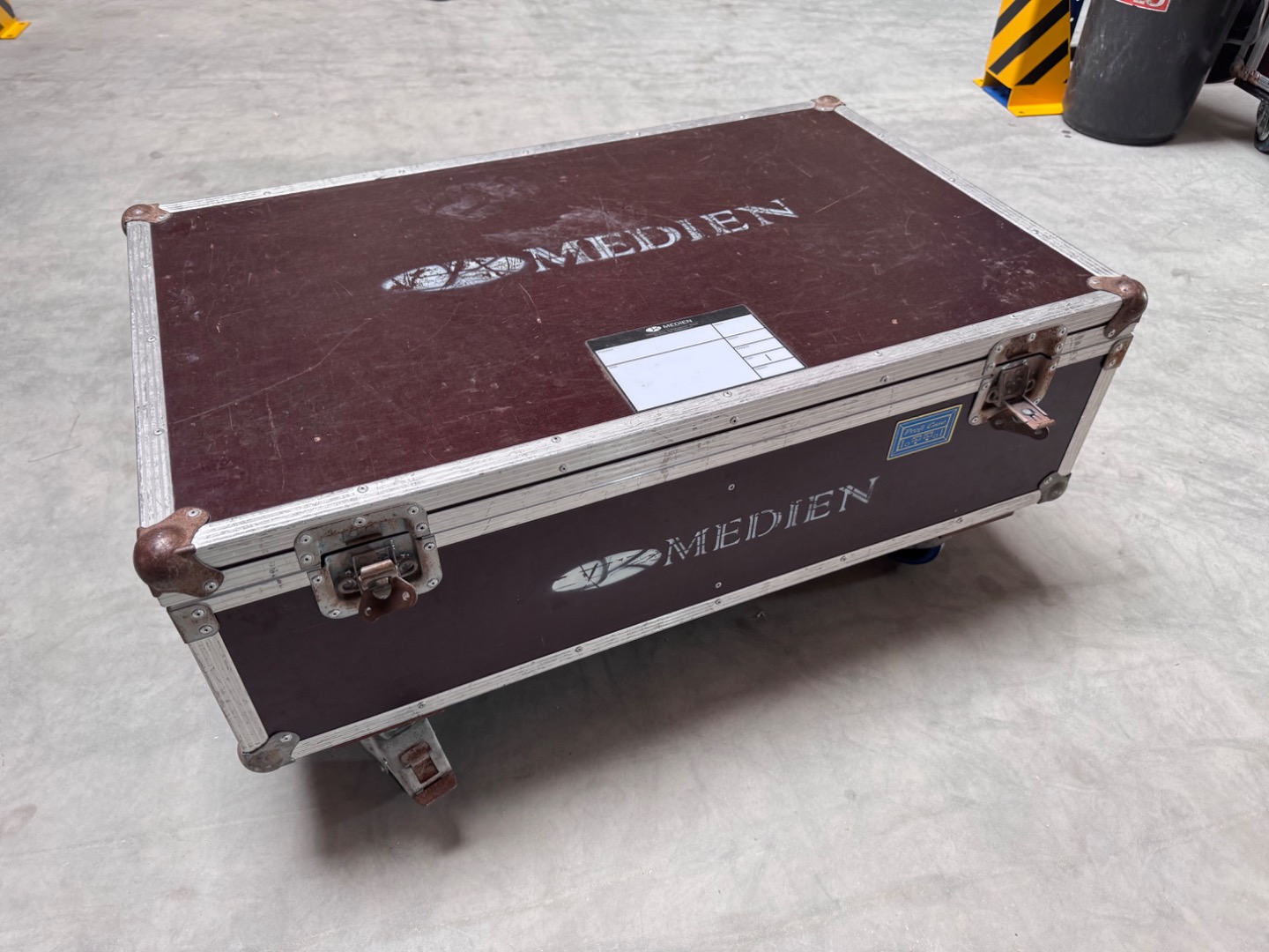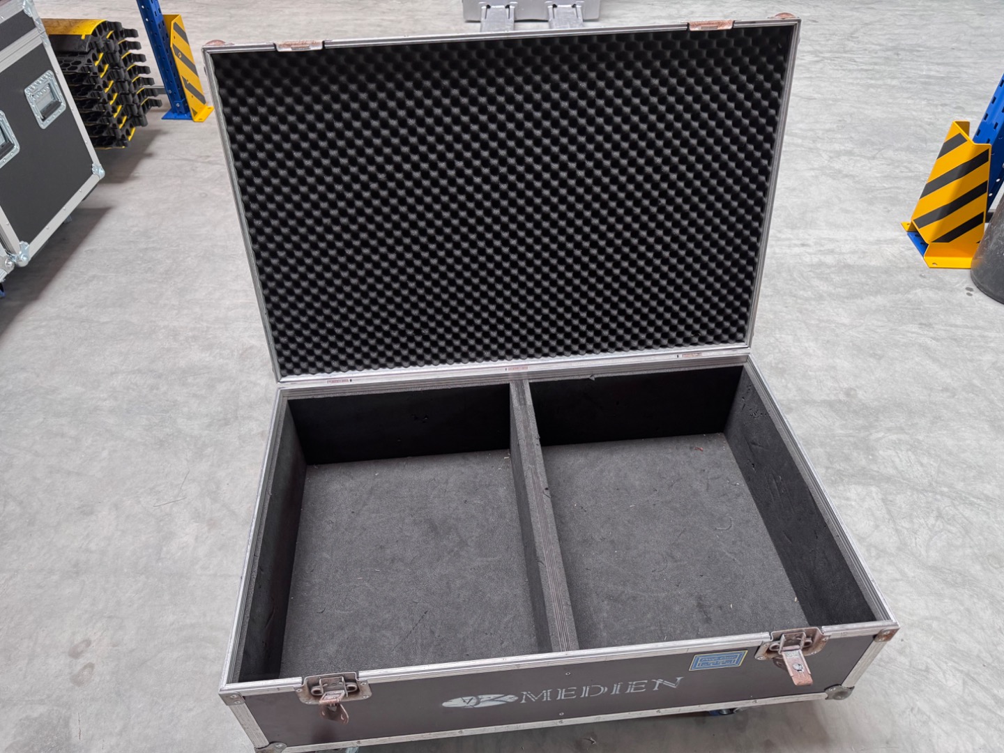 Verkauft wird ein Flightcase mit den Außenmaßen von 97x62x44cm inkl. die Höhe der Rollen. Bei diesem handelt es sich um 100mm Bluewheels mit zwei gebremsten und zwei ungebremsten Rollen.