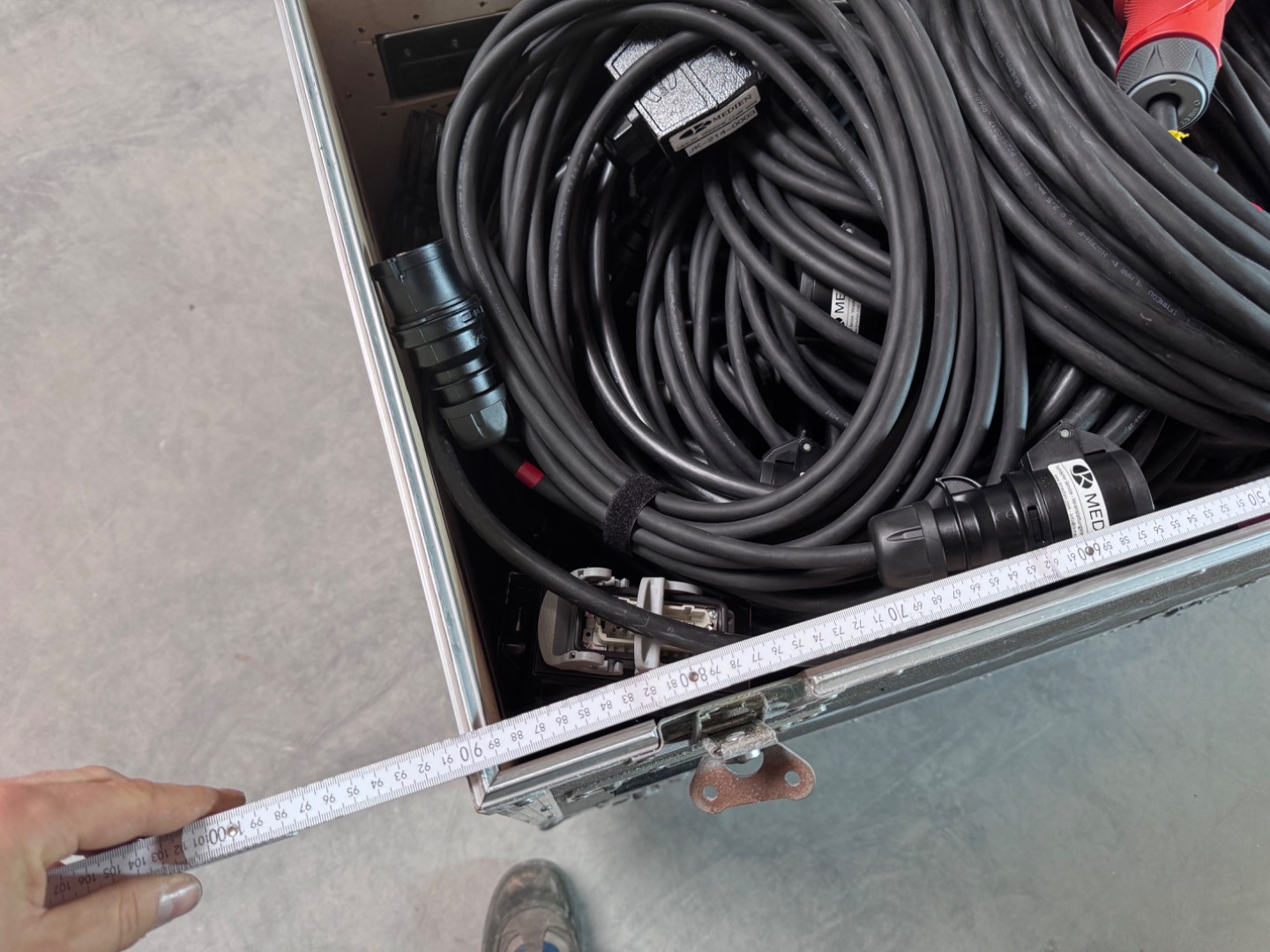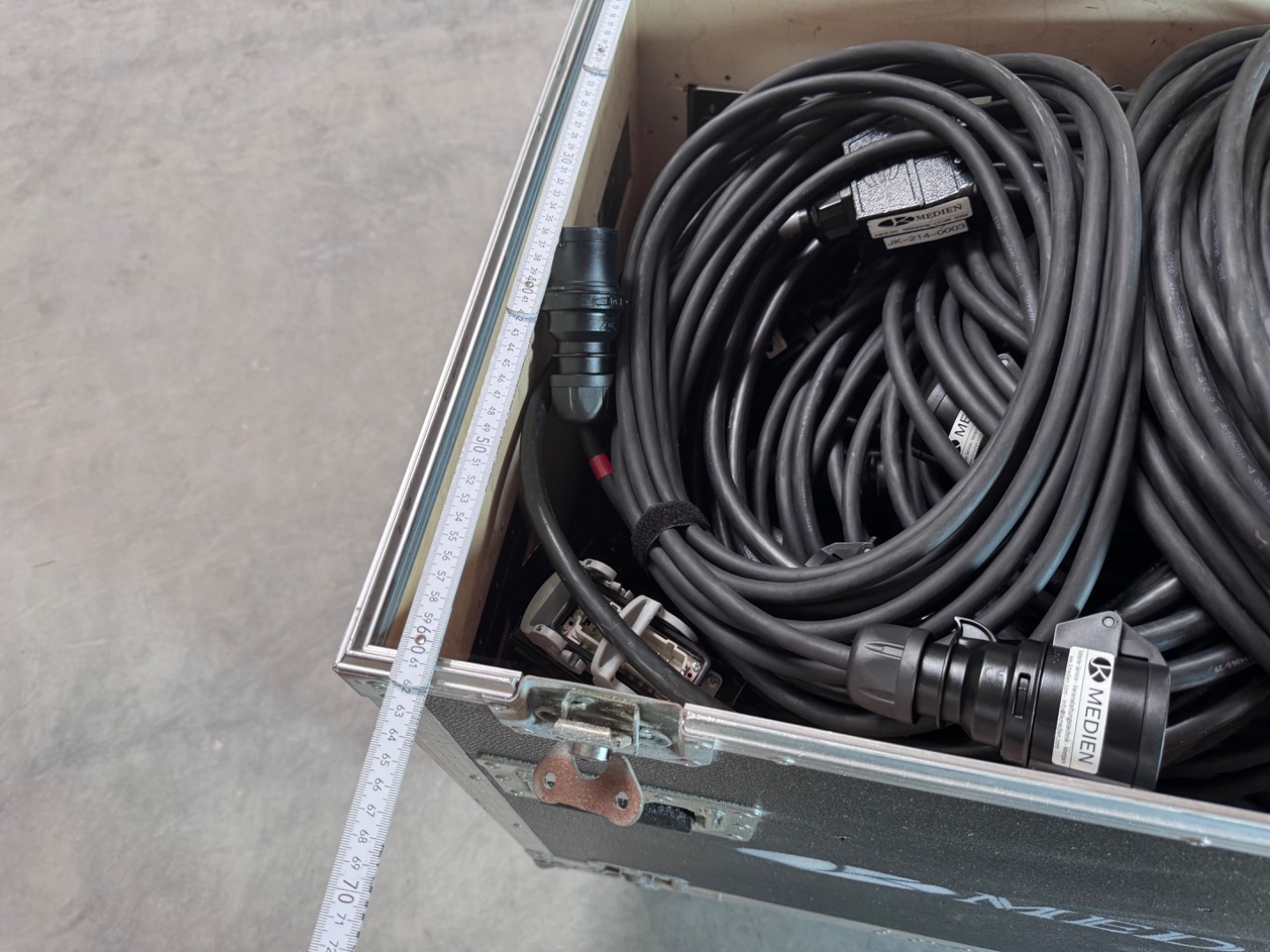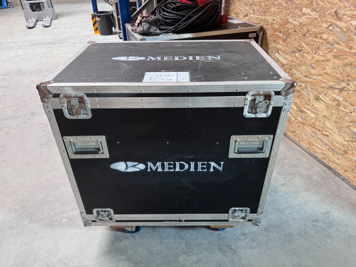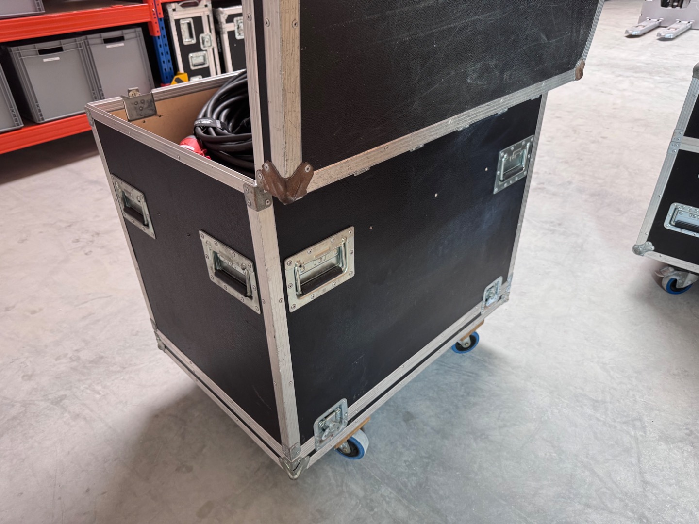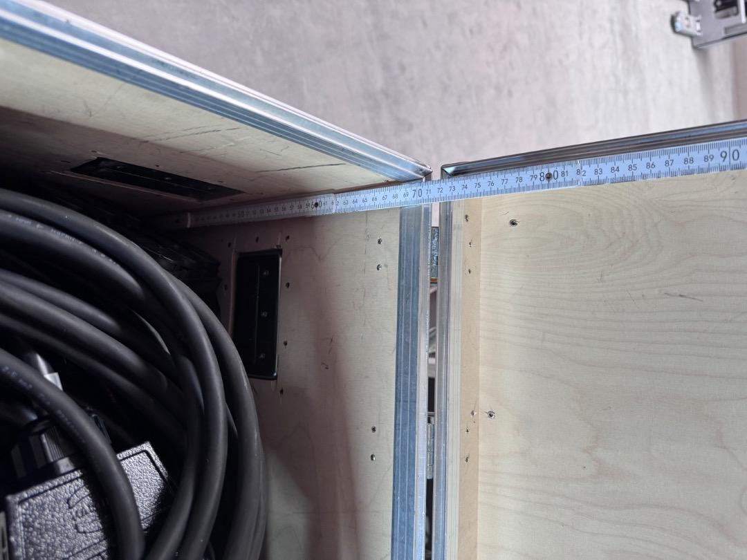 Verkauft wird ein Flightcase mit den Außenmaßen von 92x92x63cm inkl. die Höhe der Rollen. Bei diesem handelt es sich um 100mm Bluewheels mit zwei gebremsten und zwei ungebremsten Rollen.