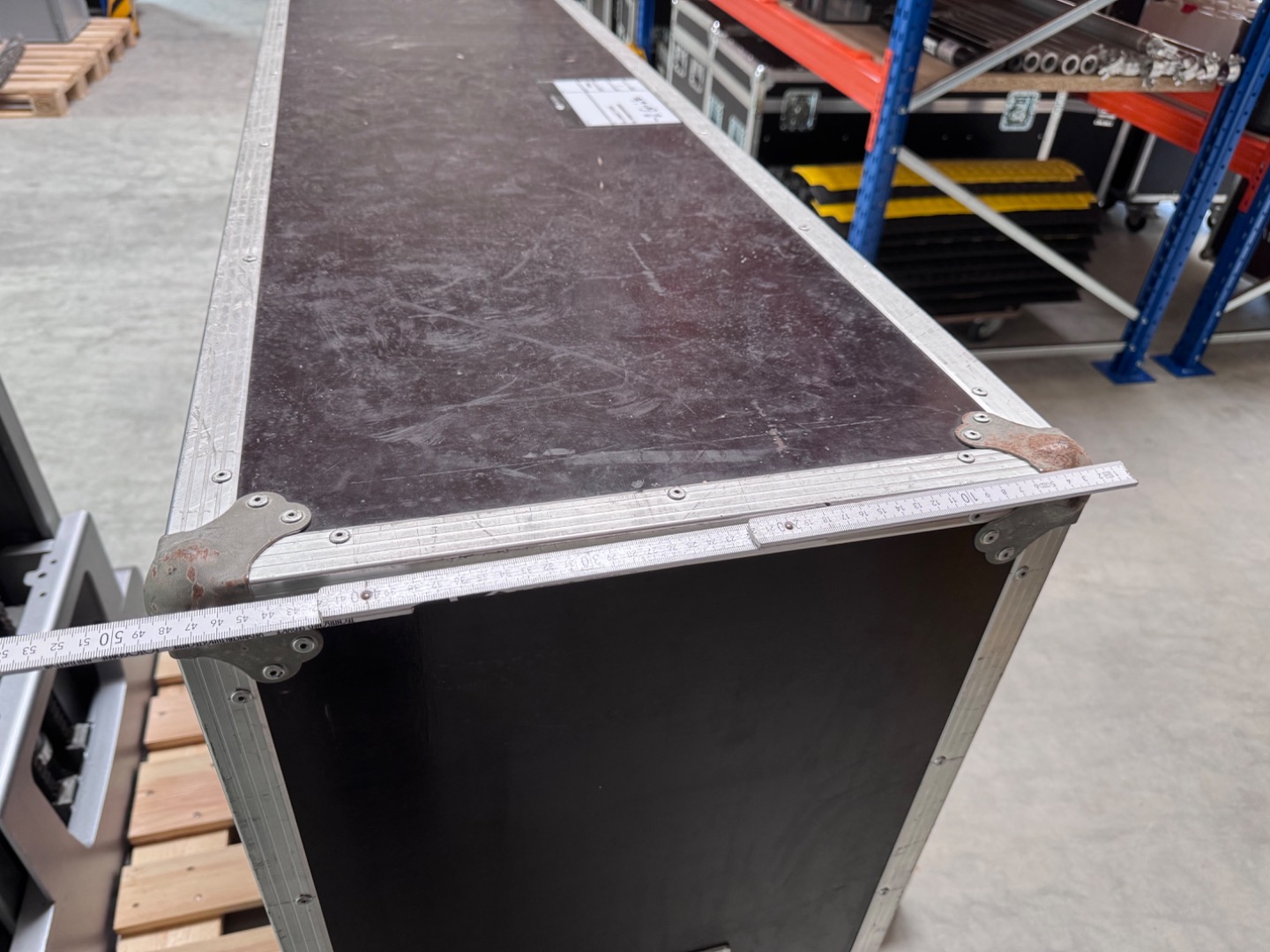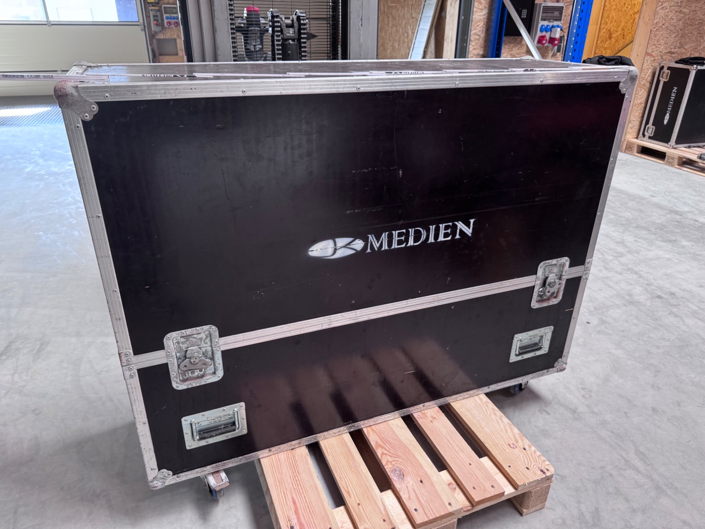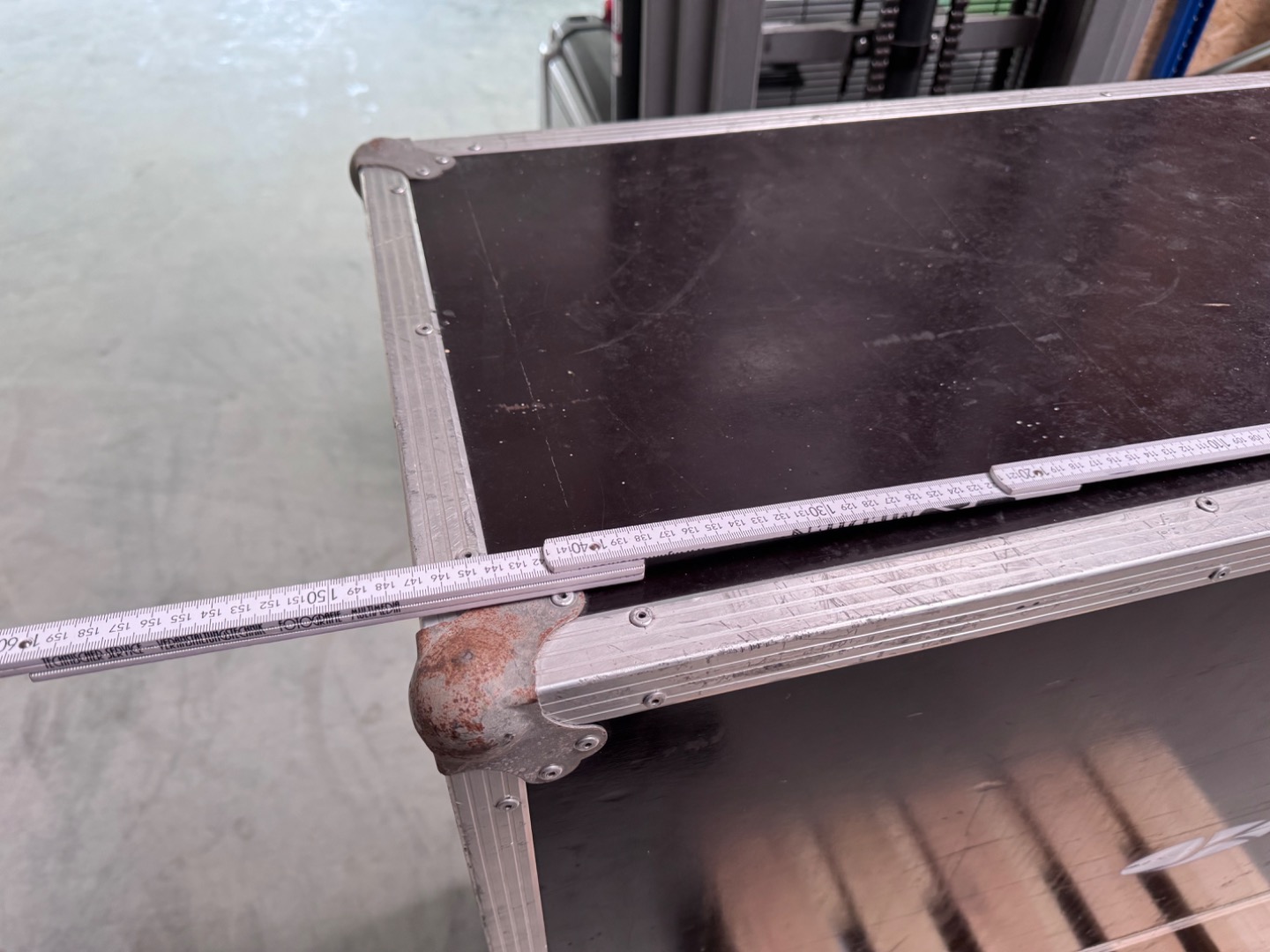 Verkauft wird ein Flightcase mit den Außenmaßen von 148x121x49cm zzgl. die Höhe der Rollen. Bei diesem handelt es sich um 100mm Bluewheels mit zwei gebremsten und zwei ungebremsten Rollen.