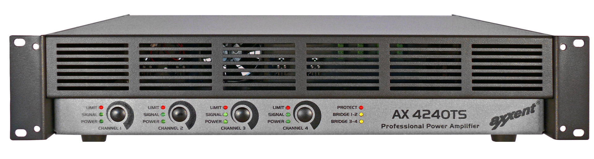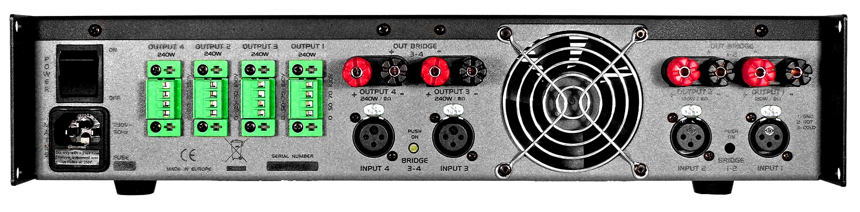 Installationsverstärker 2 HE, 4x240 W niederohmig und 50/70/100 V mit Übertragerausgang (galvanisch getrenter, erdfreier Betrieb) mit geregeltem Leiselüfter.