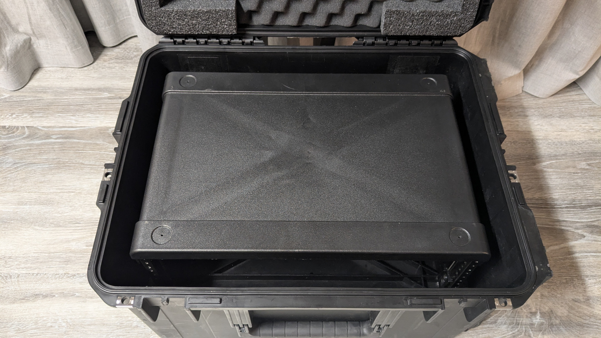 Optisch gibt es natürlich einige Gebrauchsspuren (siehe Bilder), technisch ist das Case aber in einem Top Zustand, alle Schnallen schließen sicher, die Rollen gehen leichtgängig und es gibt weder am Case noch am Rack irgendwelche Schäden oder Risse. Einzig das Druckausgleichsventil hat es nicht überlebt und wurde mit Gaffer zugeklebt.