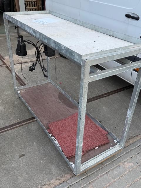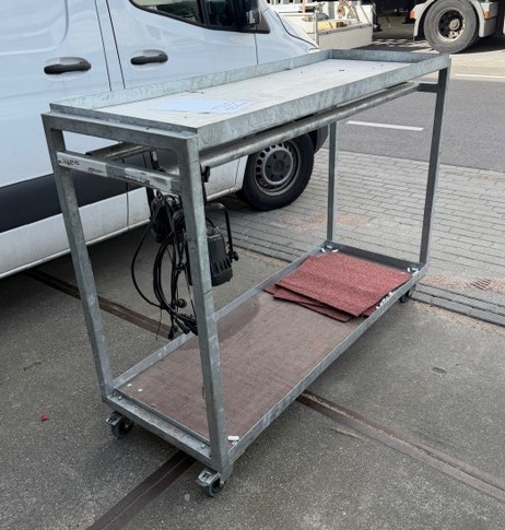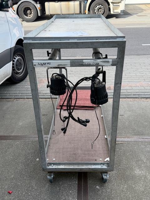Stalen transport wagen voor voorbereiding 2 rijen spots aan haak met bekabeling bovenop en zware cases onderop . Voorbereiding in de loods en door naar de locatie en gelijk overzichtelijk aanpakken.