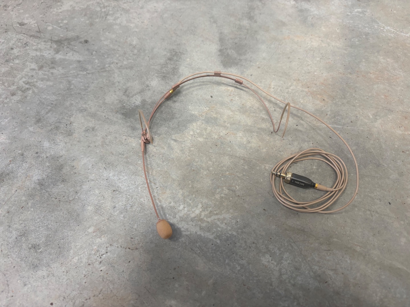 Professionelles Headset-Mikrofon in Beige mit nierencharaktieristischer Aufnahme für Sprache und Gesang. Es verfügt über eine Miniatur-Kondensatorkapsel, ein leichtes, ergonomisches Design mit flexiblem Ohrbügel und verstellbarem Federstahl-Auslegearm sowie ein Kevlar-verstärktes Kabel mit 3,5 mm TRS-Stecker. Ideal für Präsentationen, Theater, Live-Auftritte und Broadcast-Anwendungen.
