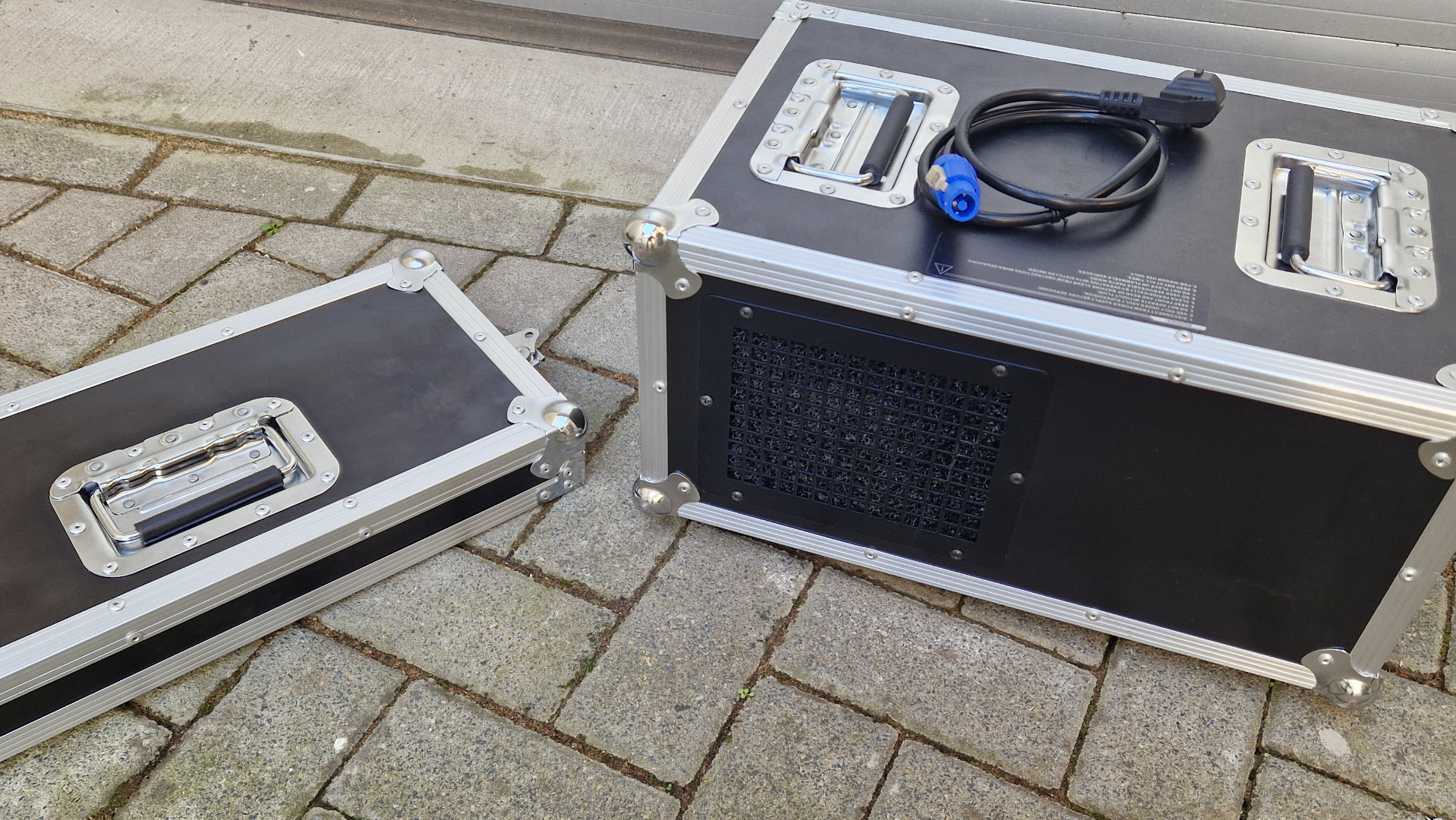 Starke 1000-W-Dunstmaschine (DMX/manuelle Bedienung), fest im Case verbaut