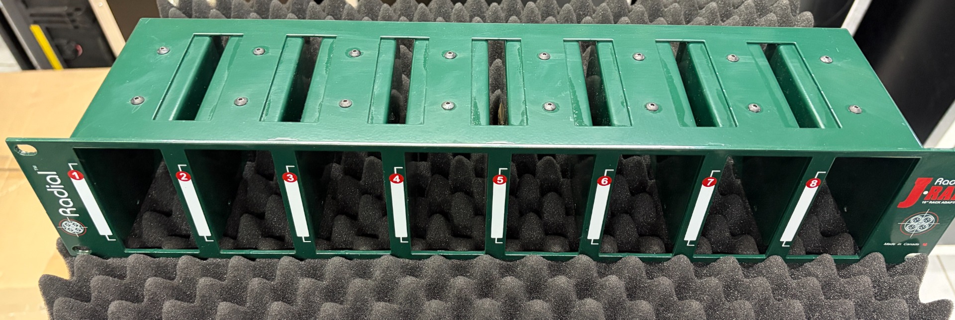 Most Radial direct boxes, splitters, isolators and Reampers may be rack-mounted using either the J-Rak 4™ or the J-Rak 8™. These enable multiple units to be combined and safely stored for touring or used as part of a permanent installation. Mounting the DIs is easy. You simply remove the outer shell and slide the inner frame into one of the racks
