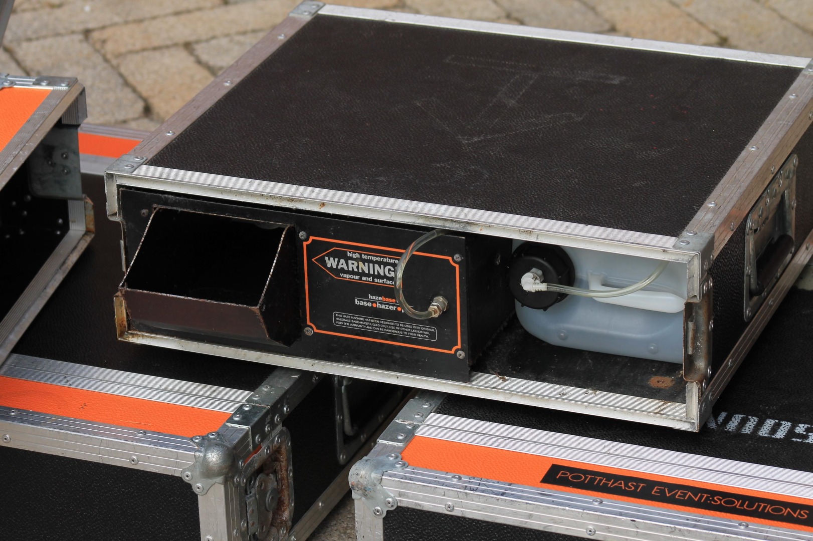 Zum Verkauf stehen bis zu drei Hazebase Base Hazer Pro 1500W Dunstnebelmaschinen im original Amptown Case inkl. Hazebase Base Flyer Flugrahmen für Base Hazer Pro.