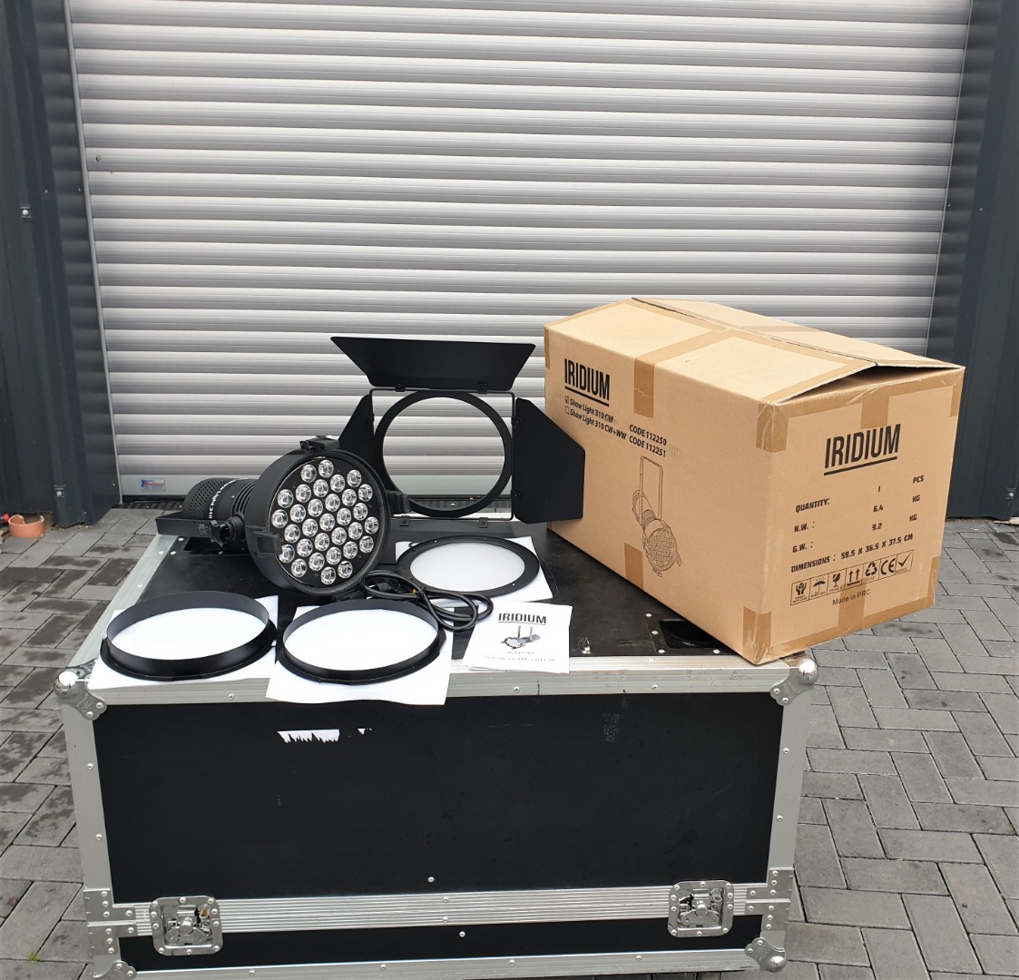 Zum Verkauf steht ein Iridium Showlight 310 CW. Durch das umfangreiche Zubehör und die 300W Leistung kann es gut als Messestrahler verwendet werden.