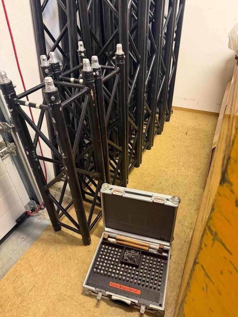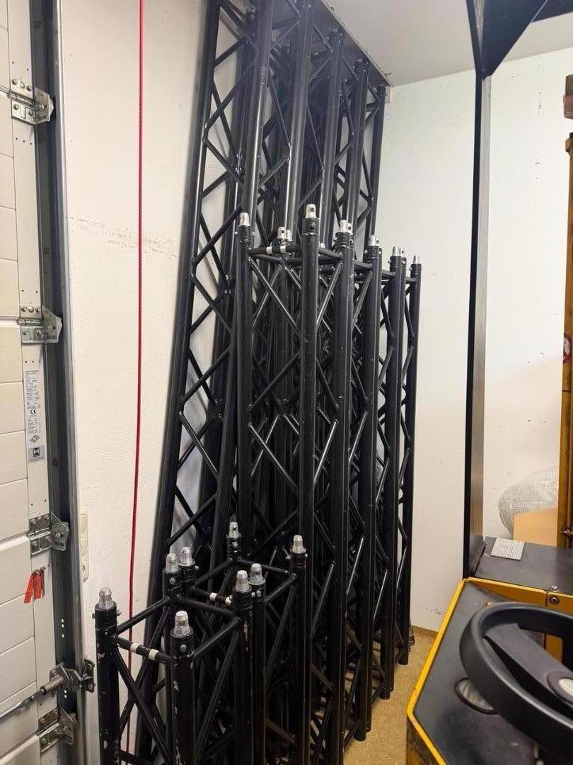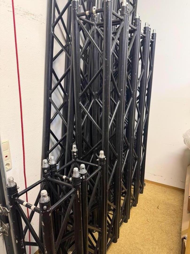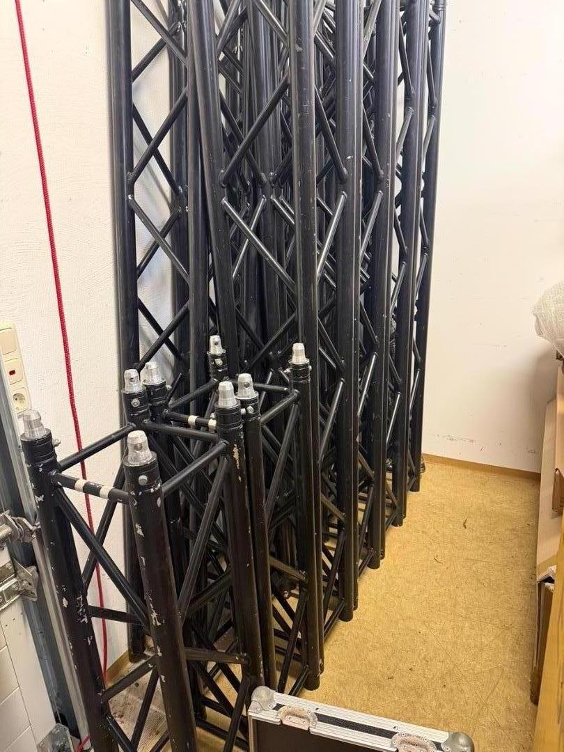 Insgesamt somit 22m Trussing... ideal für ein Rock´n Roll Besteck mit Front- und Backtruss, welches auch mal in den Sprinter passen soll aufgrund der Stückelungen bzw. Längen... ein 3m Trussstück hat eine kleine Delle und natürlich haben die Traversen auch Gebrauchsspuren und die fallen bei schwarz halt leider nun auch mal etwas leichter ins Auge als bei silber, aber ne Spraydose schwarzen Sprühlack zum gelegentlichen Ausbessern gibts dann auch gerne Gratis noch mit dazu! :-)