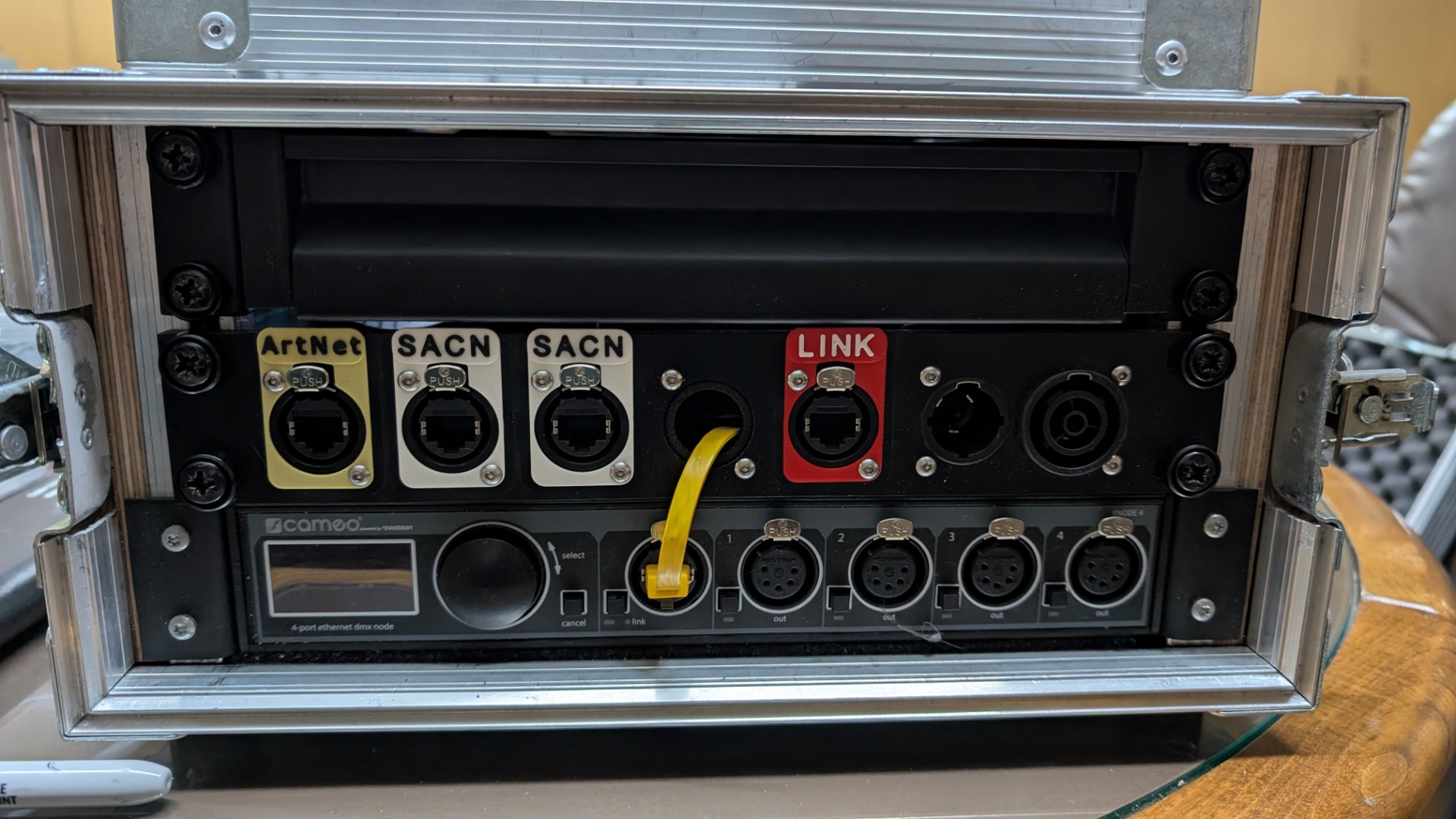 - 1x Custom gefräste Anschlussblende mit Neutrik Ethercons und TR1 KombiBuchse