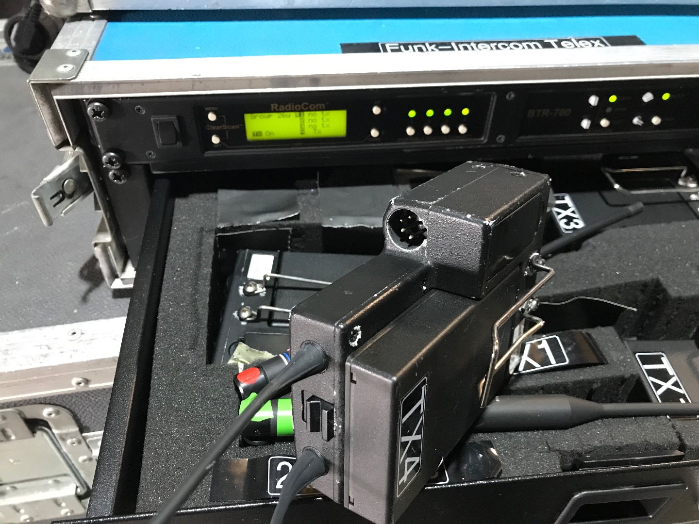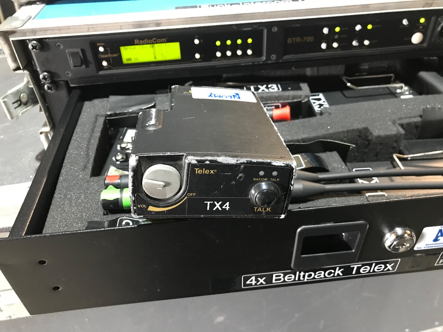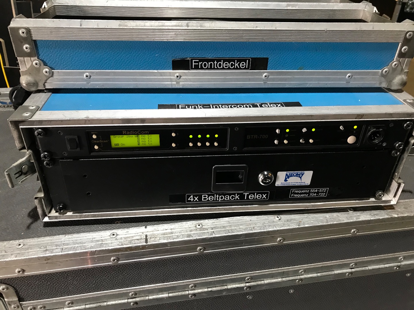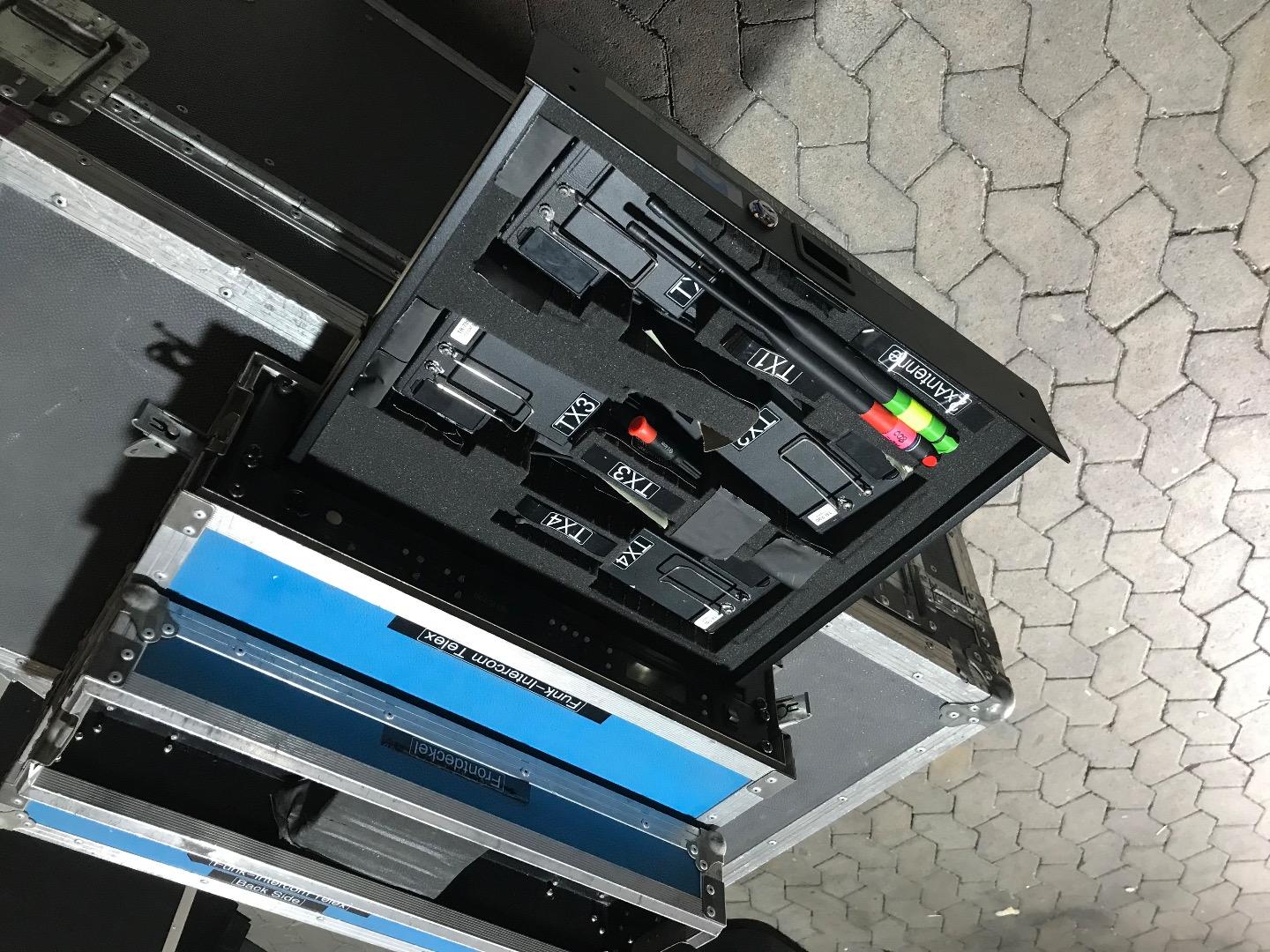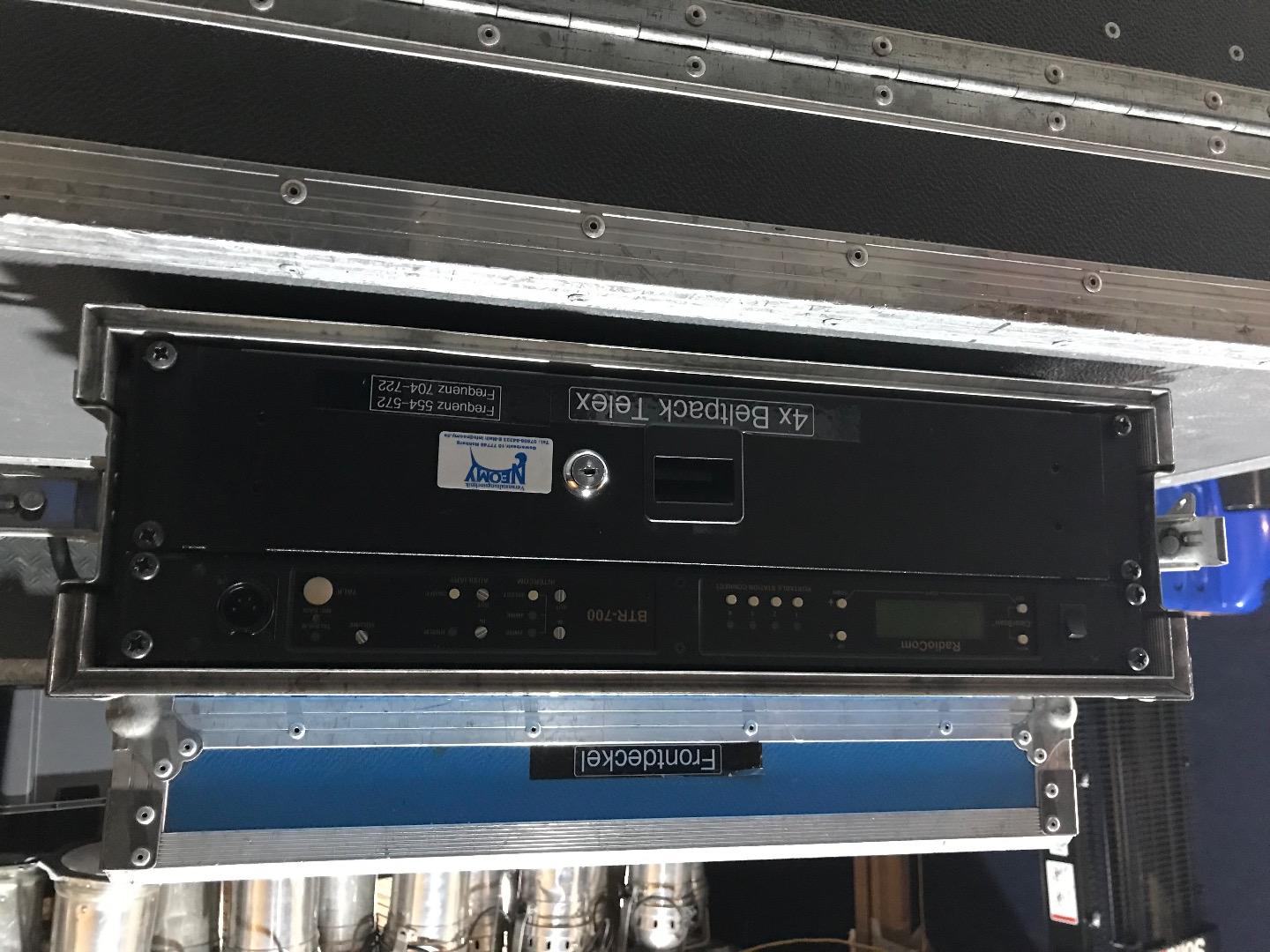Verkaufe UHF Intercomsystem,1Empängerrack 4Kanall BTR 700 mit Rackschublade für 4Beltpacks TR700,incl. Headsets separat,alles funktioniert einwandfrei,incl Akkus und 8Ladeschalen,zusätzlich gibt es einen zusätzlichen Empfänger 4Kanal und 2Beltpacks ,funktioniert auch,und zusätzliche Beltpacks zum ausschlachten.incl 2Dipol Antennen und Kabel.Versand in 2Paketen 48€netto.