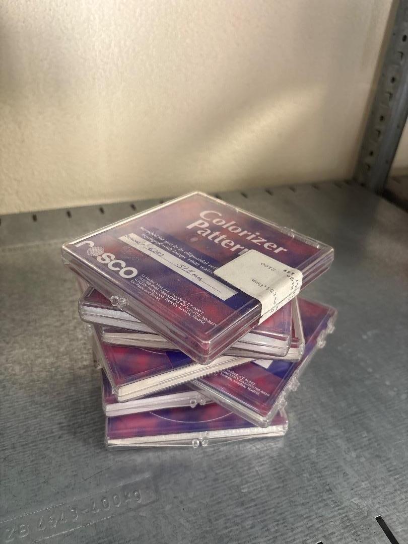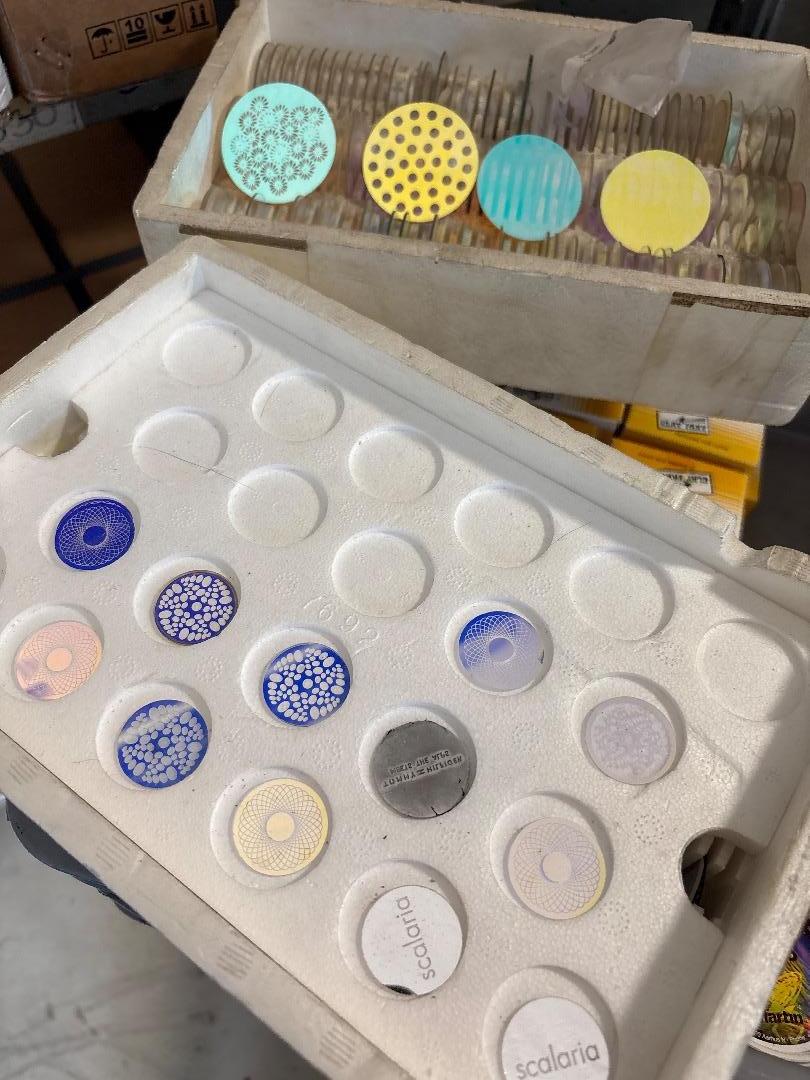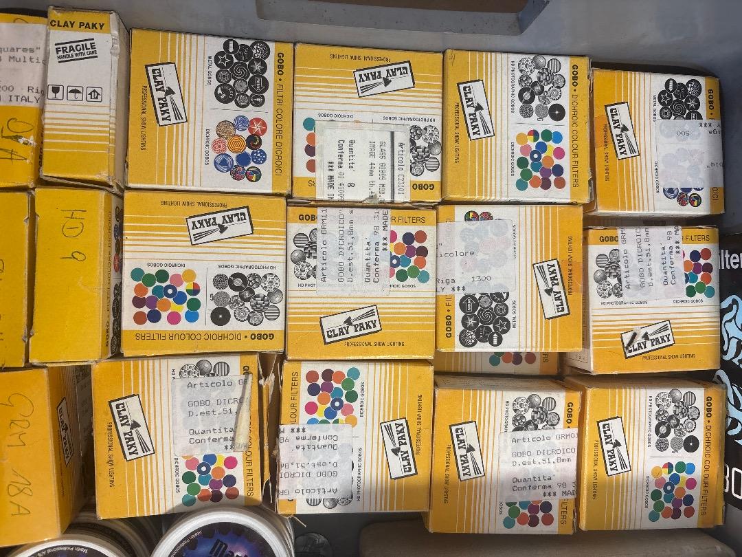 In der Kiste befinden sich verschiedenste Gobos von verschidenen Herstellern. Darunter Clay Paky, Martin, Lee Filters, usw…