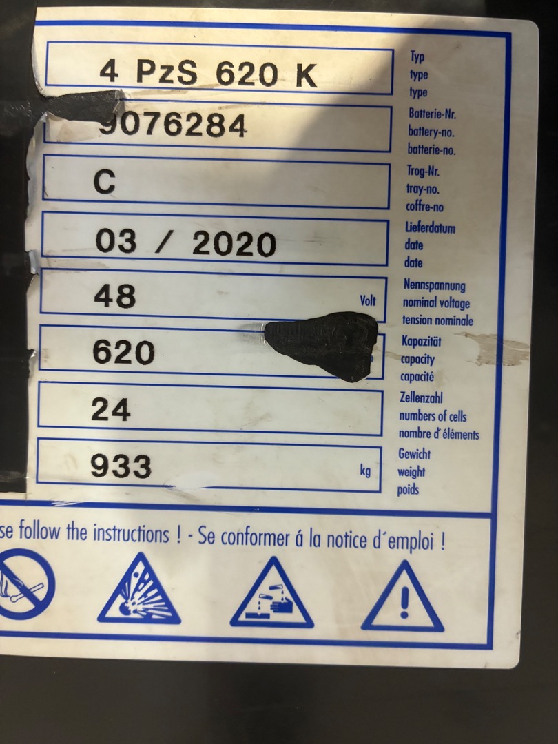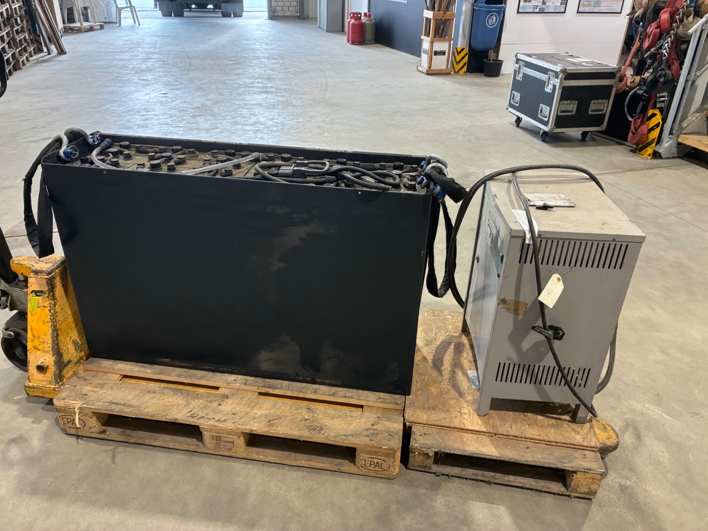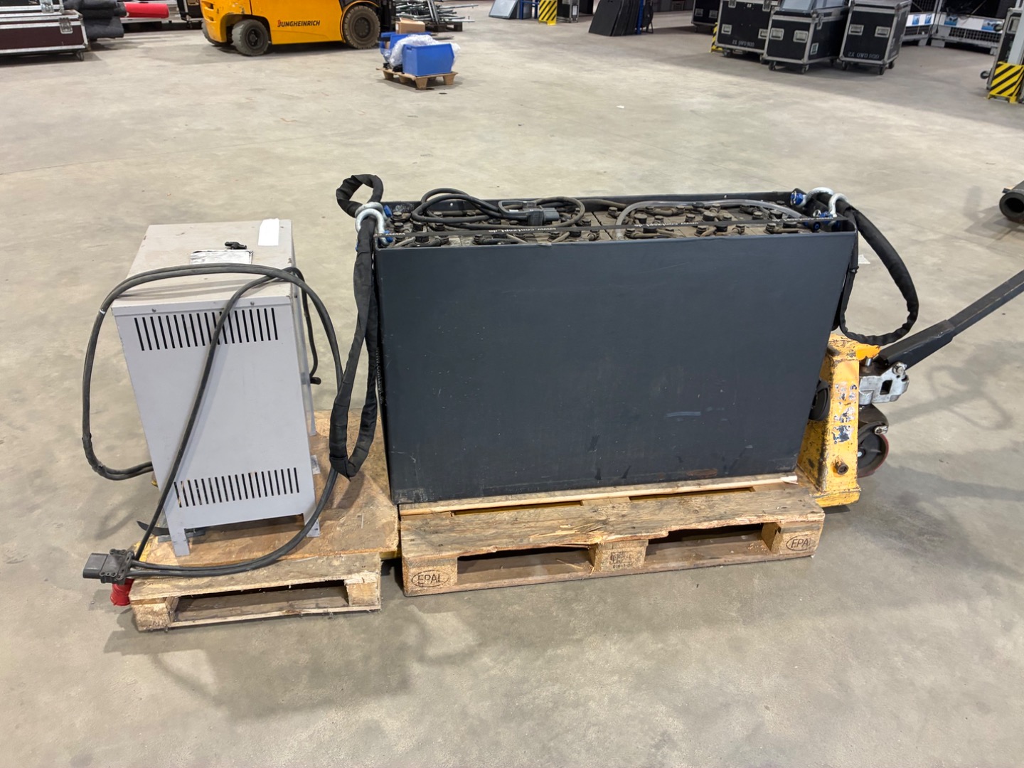 Eine Batterie für einen Linde Schubmaststapler inklusive Ladegerät.