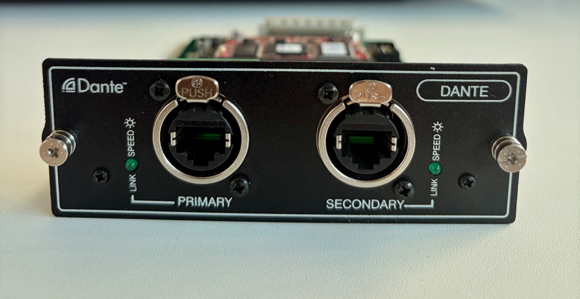 The DANTE card connects to an Audinate DanteTM network, and allows the console to send and receive up to 64 channels in each direction.