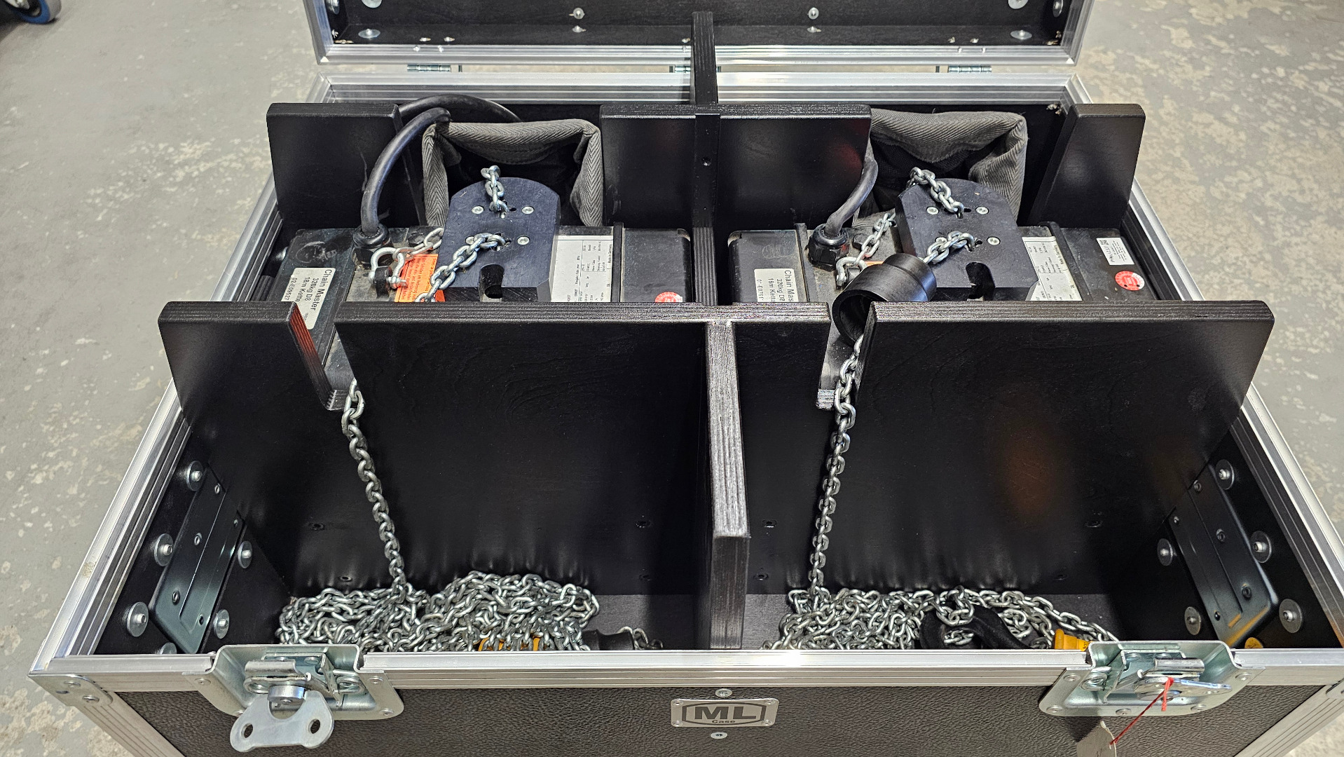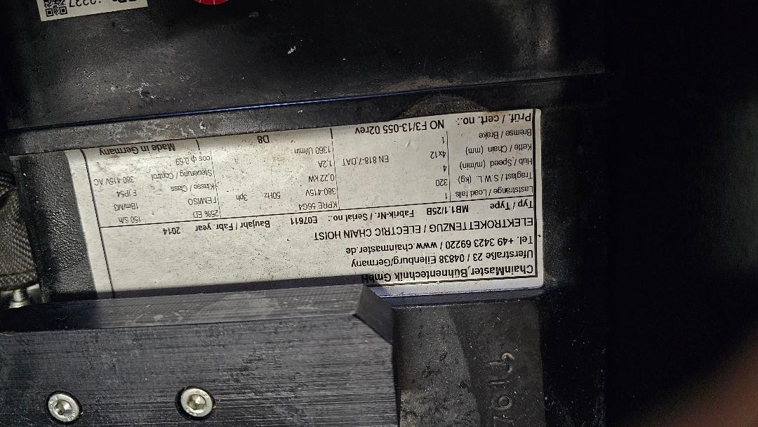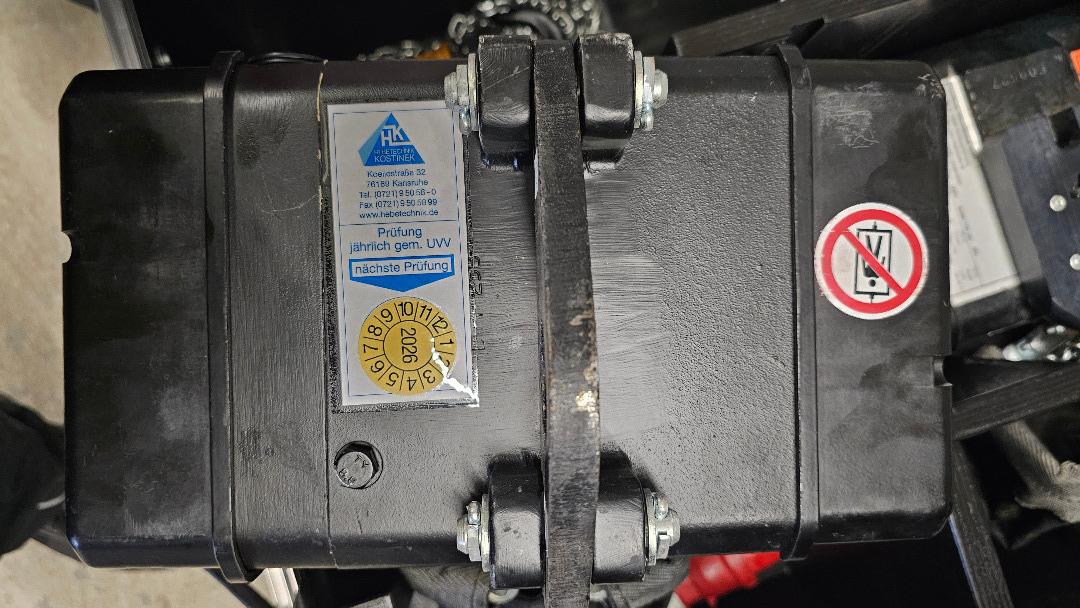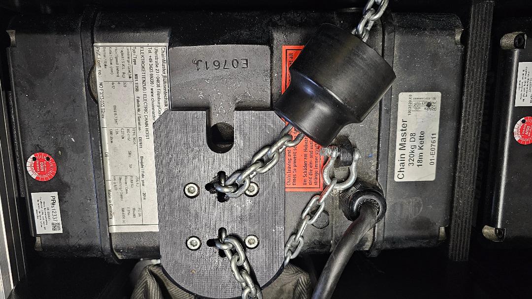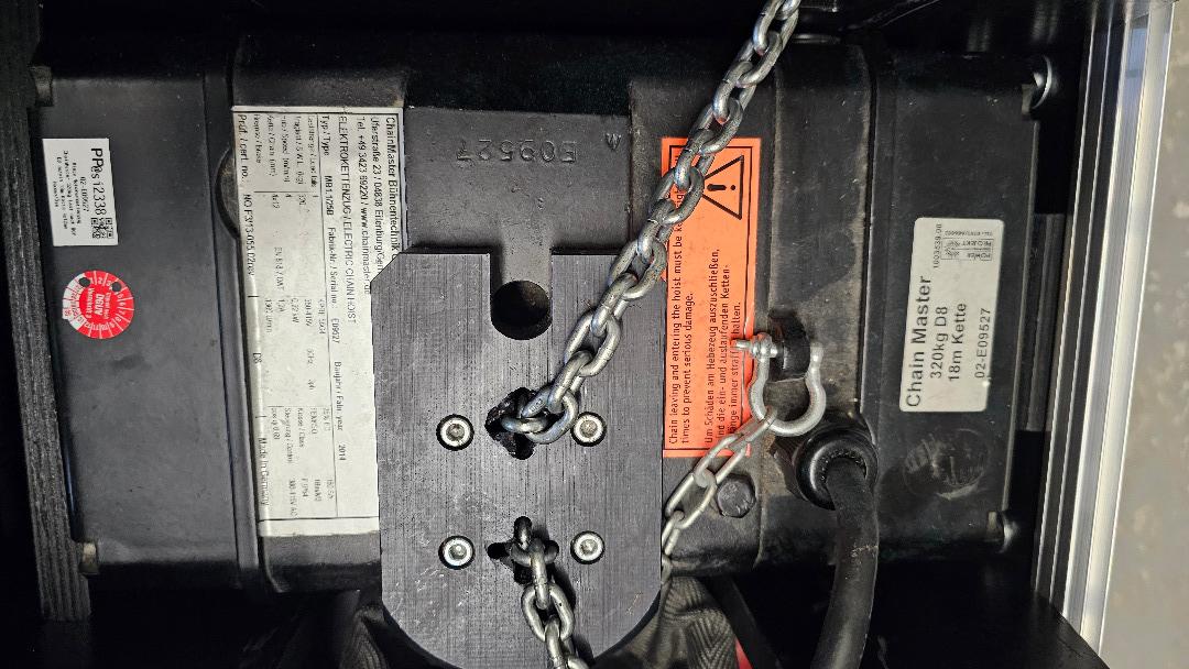 Motorentyp MB1.1/25B Baujahr 2014 Kette. 18m lang ,guter Zustand (nicht vergammelt/ verrostet oder so).Die Motoren wurden nur selten verwendet. Die Motoren wurden am 28.10.2026 nach DGUV54 geprüft und haben auch eine aktuelle BGV A3 Elektro Prüfung. Kette: 4x12mm 1 Strang : 320kG. Maße ML Case: 73cm x 60cm Höhe: 50cm inkl Rollen gemesse, 2 x Rollen mit Bremse, 4 Griffe. Am besten Abholung in Karlsruhe
