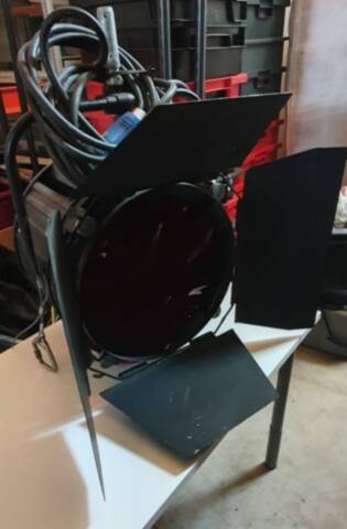 Set of three professional studio lights including two 5kW single-bulb units (2-pin) and one twin 2.5kW unit (4-pin, bulb not included), all with barndoors, without filterframes. Pole-operated pan, tilt, zoom, and power with 29mm spigot-compatible stirrups for hanging or stand-mounting. Adjustable beam angle of 12.5° to 56.5° and equipped with CEE 32A single-phase connector. Professionally maintained.
