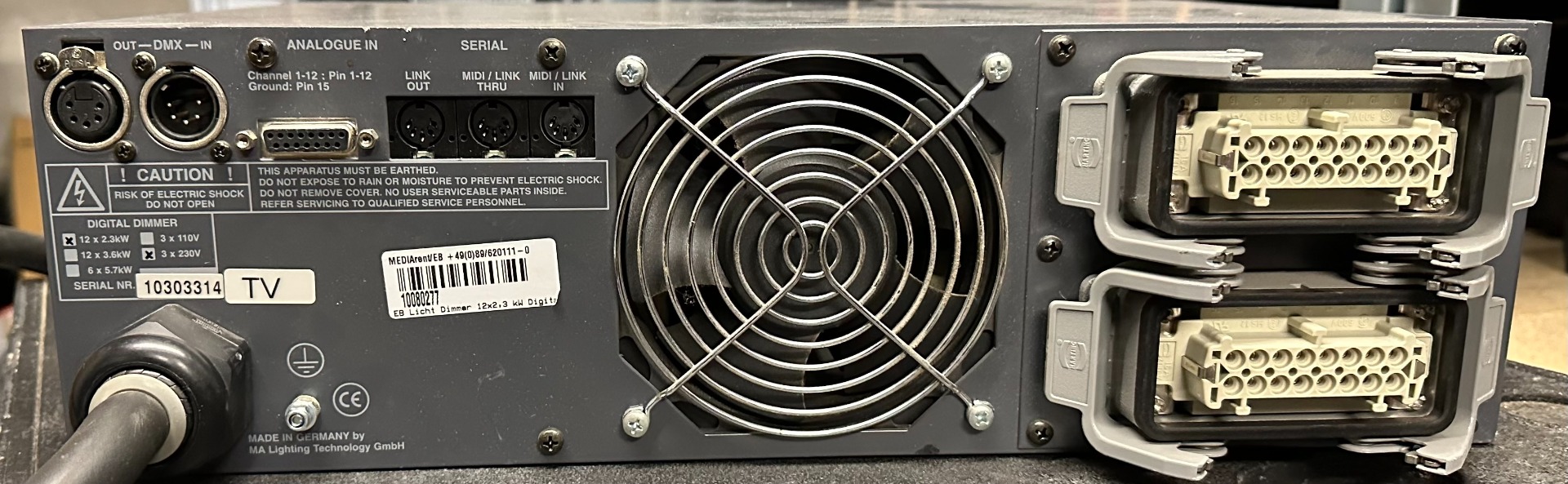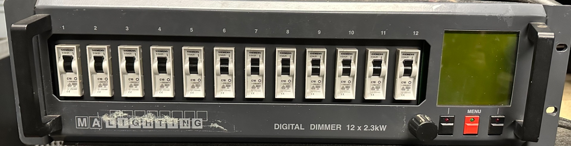 Digital-Dimmer-Einschub 19"/3HE mit zwölf Einzel-Kreisen 2,3kVA. Steuerung über Hochleistungsrechner mit Time-Processing-Unit, digitale Einstellung des Zündzeitpunktes beim Phasenanschnitt. Alle Einstellungsdaten und gespeicherte Memories werden im nichtflüchtigen EPROM abgelegt. Austausch des Betriebssystems für spätere Software-Erweiterungen per EPROM möglich. DMX-Ansteuerung mit Einzelkanal- oder Sequenz-Patch, Haltefunktion oder Memory für die Dimmerausgangswerte bei DMX-Ausfall vorwählbar. Master-/Slave-Kopplung mit weiteren Dimmern (z.B. in einem Dimmer-Rack) möglich.