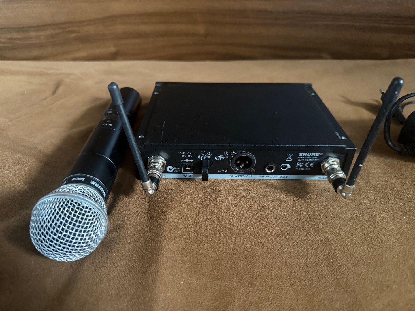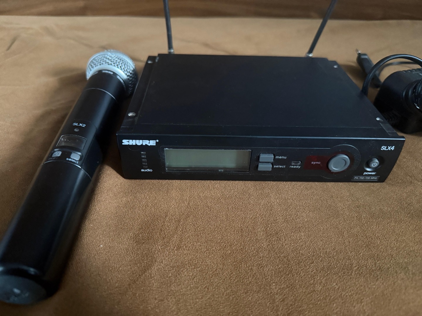 Verkaufe ein Shure Funkmikrofon-Set – bestehend aus dem SLX4-Empfänger und dem SLX2-Handsender mit der legendären SM58-Kapsel.