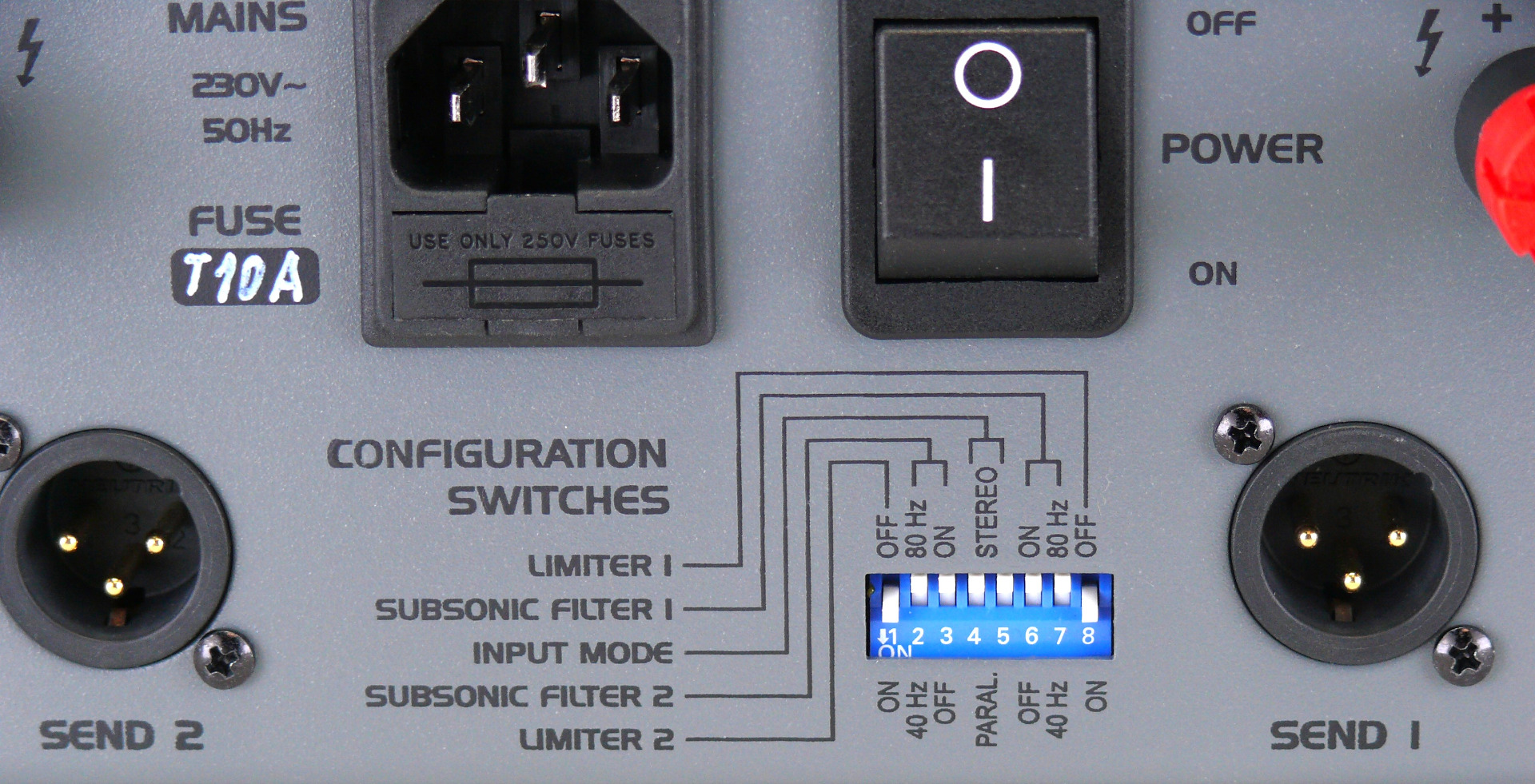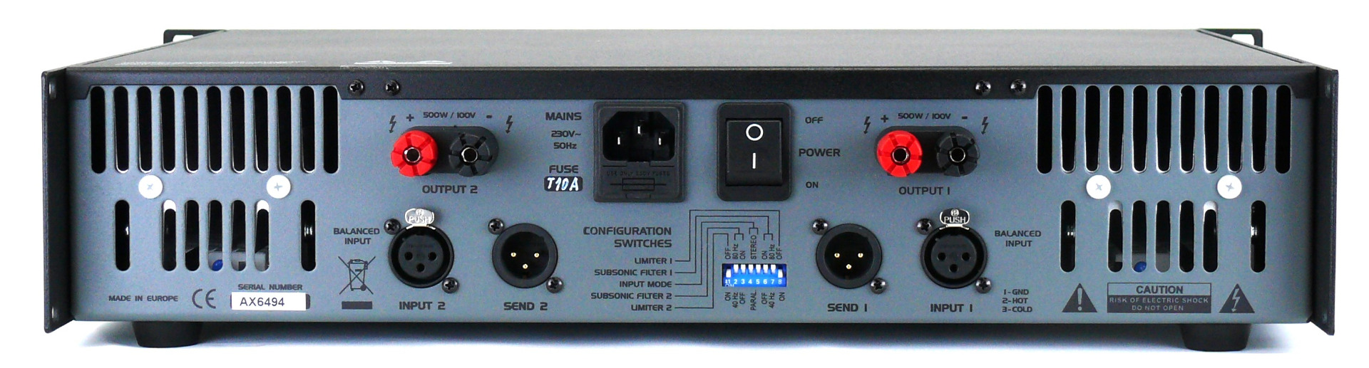 Installationsverstärker 2 HE, 2x500 W an 100 V mit Übertragerausgang (erdfreier Betrieb).