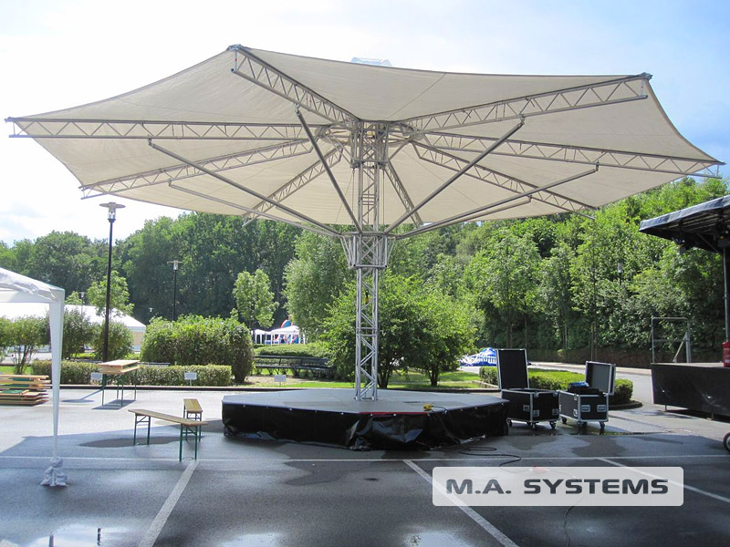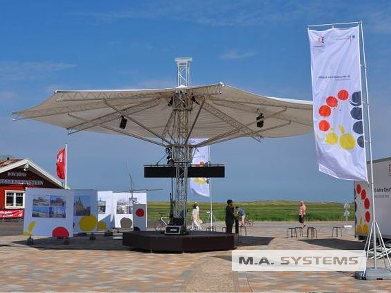 Ursprünglich für eine Roadshow entwickelt, fand die Überdachung aber auch Anwendung als 360° Moderationsbühne, Theke oder hochgelegene Sitzfläche.