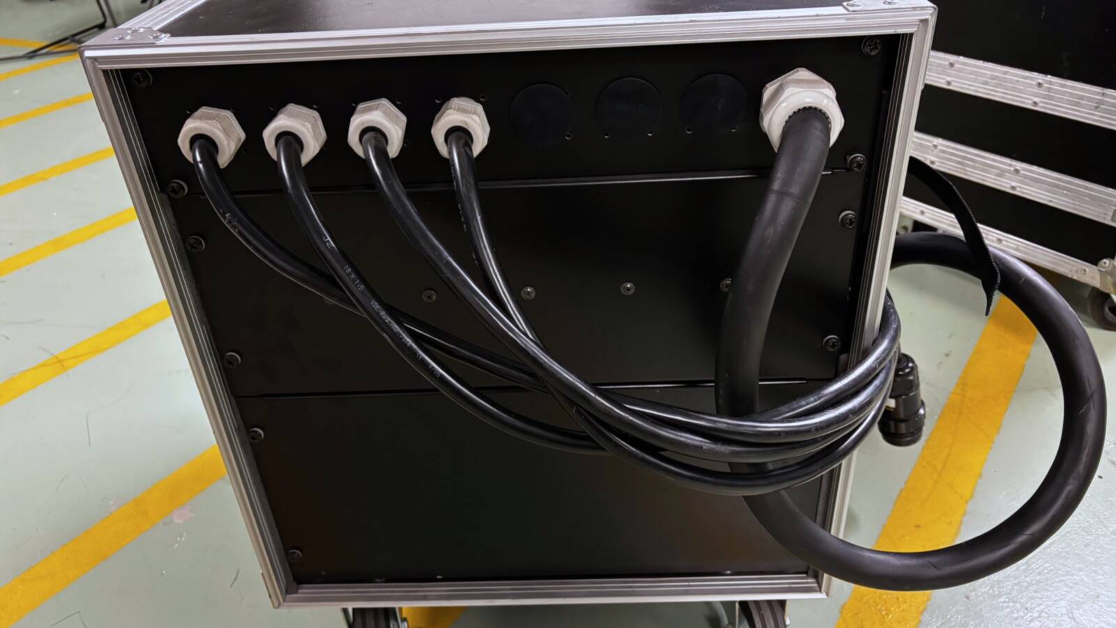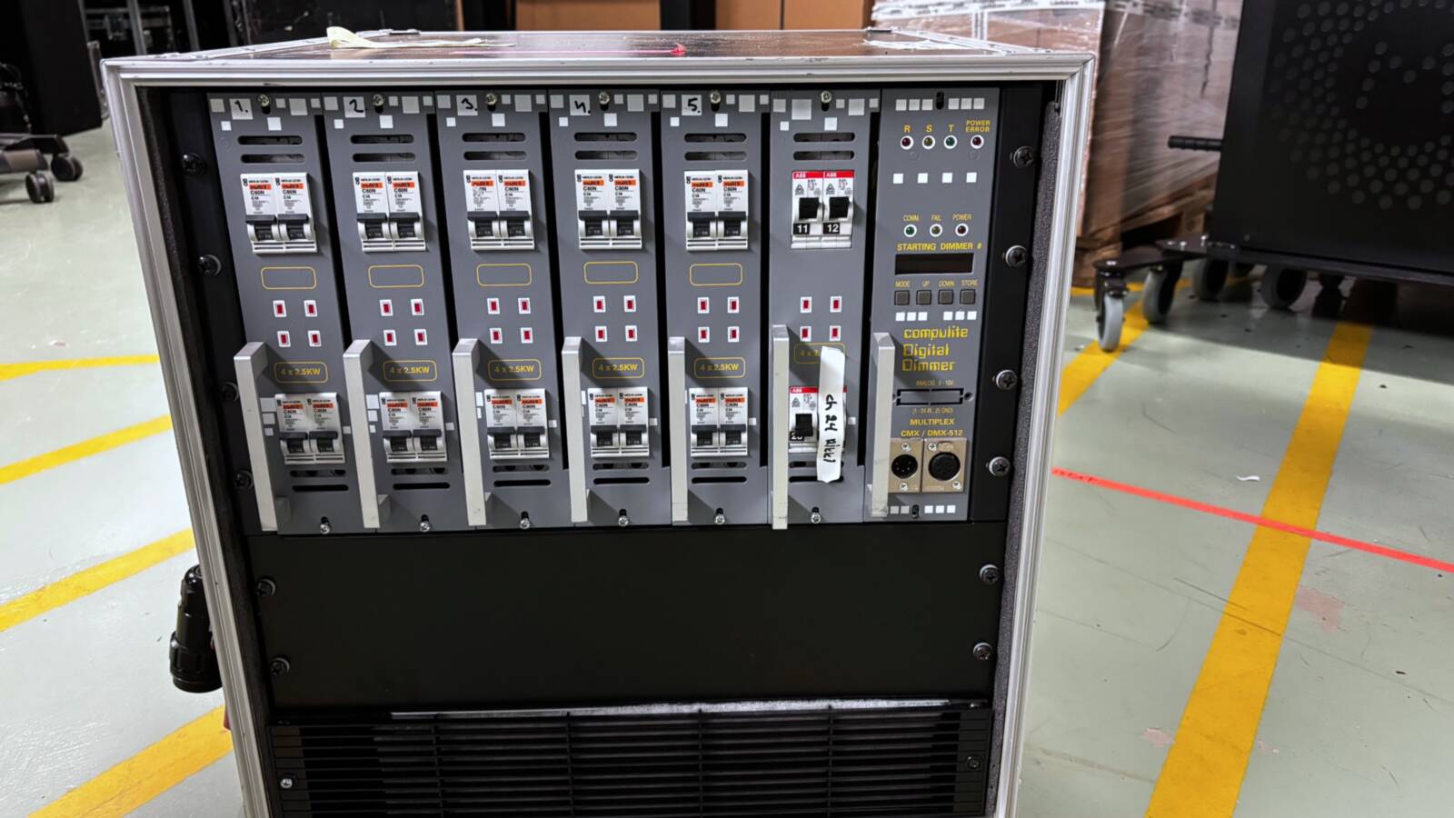 24-channel modular dimmer rack featuring DMX in/thru on 5-pin XLR, 63A 3-phase CEE mains input, and four Socapex outputs with 1-meter cables. Each channel is equipped with its own circuit breaker. The unit is housed in a wheeled case without lids and has only been used indoors at a single venue. Channel 24 remains on continuously.