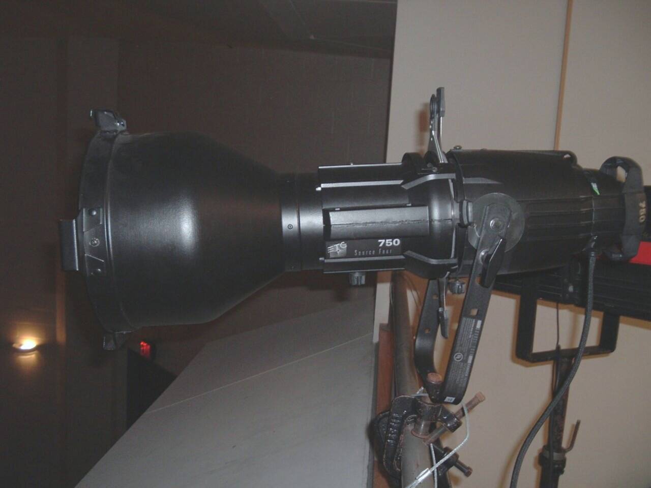 Set of four profile spotlights featuring 10-degree lenses, each equipped with four shutter blades and slots for iris or gobos. Fitted with 750W HPL bulbs and regularly maintained. Clamp not included.