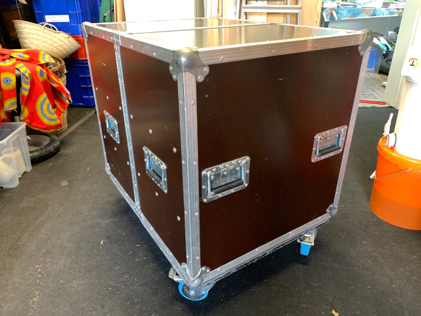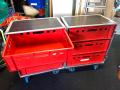 Das Case kann ausseinander geklappt und z.b. als Verkaufstresen von Merchandise verwendet werden. Die darin befindlichen 6 stk Eurokisten können wie Schubladen heraus gezogen oder ganz heraus genommen werden.