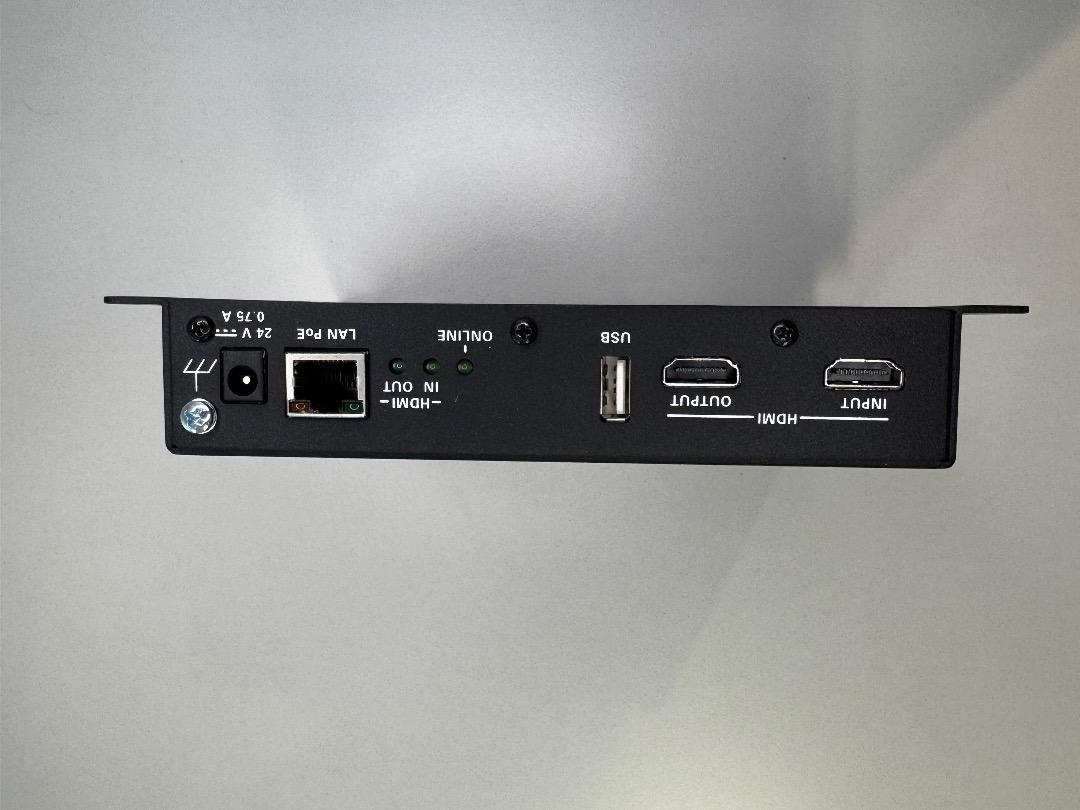 Ein HDMI-Eingang ermöglicht den Anschluss lokaler Geräte wie Mini-PCs oder Laptops. Zusätzlich steht ein HDMI-Ausgang zur Verbindung mit einem Display (HD oder WUXGA) zur Verfügung.