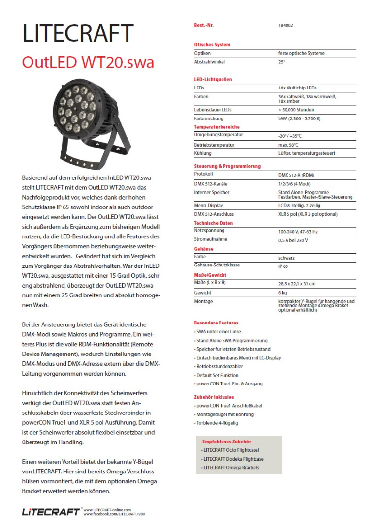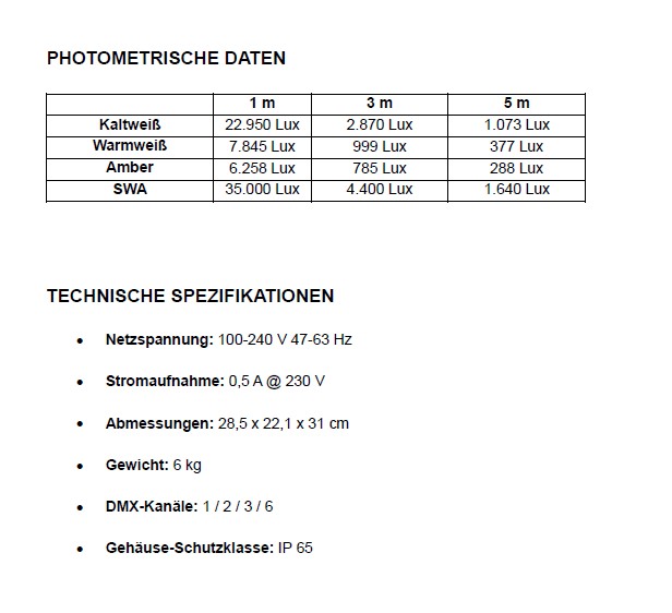 115W SWA LED Ausgangsleistung, DMX 5pol XLR Anschluß, IP65 für den Außeneinsatz und im Regen!