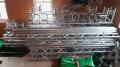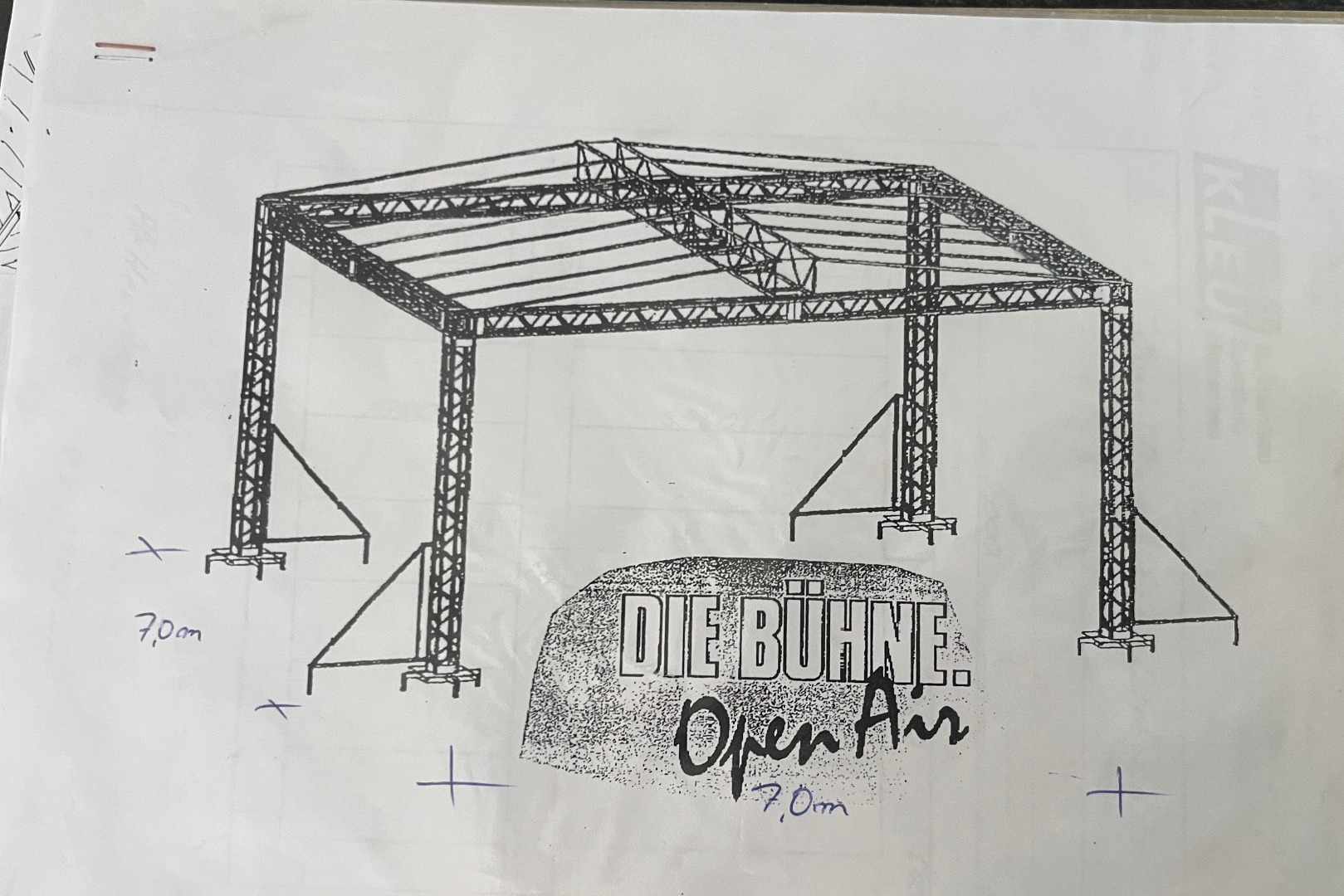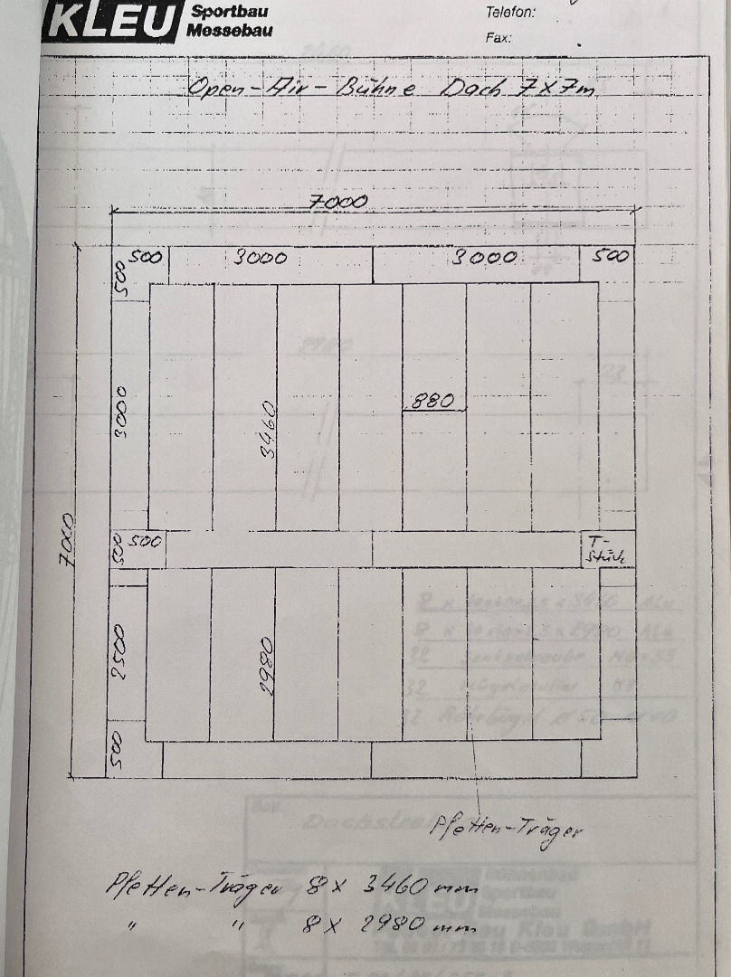 Open Air Bühne 7m x 7m, komplett mit Bühnenpodesten (Schere), Dachplane + Seitenplanen, Geländern, Treppe, Traverse usw.